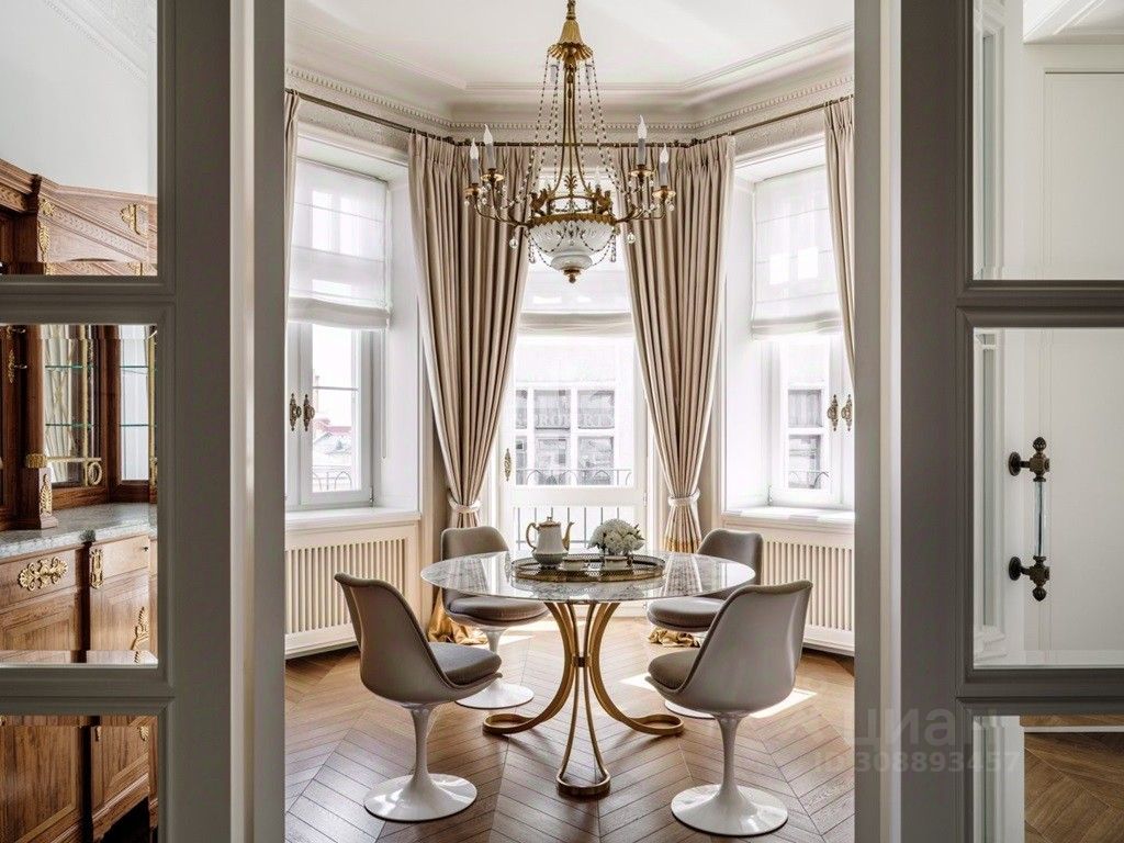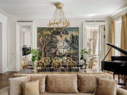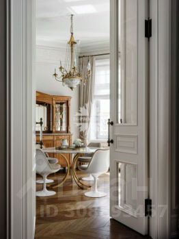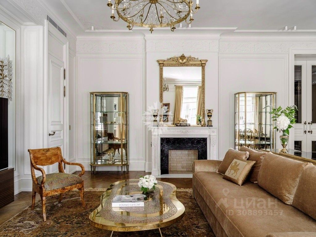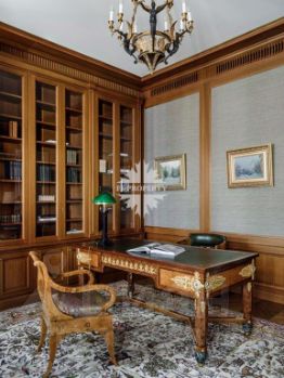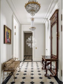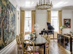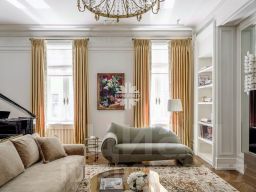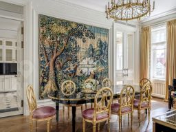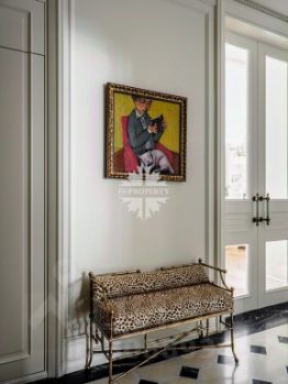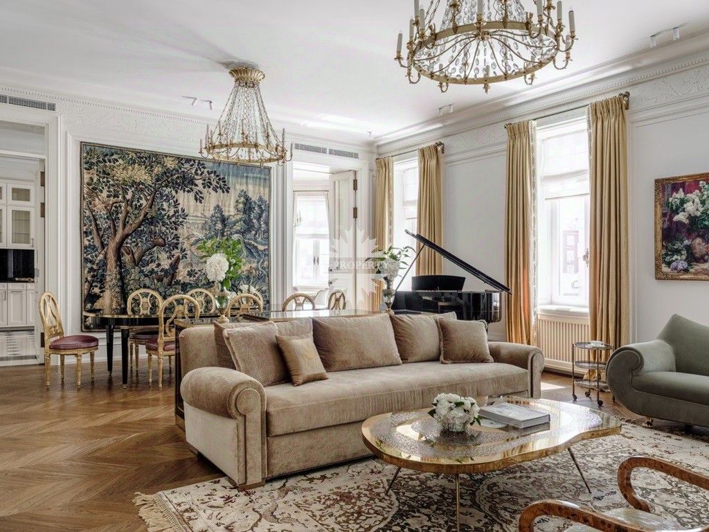 Неповторимый стиль и эстетика в каждой детали квартиры. Предметы мебели, изготовленные на заказ, превосходно сочетаются с винтажными элементами декора. Мрамор, красное дерево, позолота, шелковые обои, гобелены 18 века, антикварные люстры создают атмосферу изысканной роскоши.