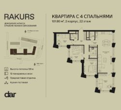 Продаётся 4-комнатная квартира 101.80 м² в жилом комплексе Ракурс. Квартиру отличают панорамное остекление, потолки 3,6 м, улучшенная шумо и воздухоизоляция. Дом сдаётся в 1 квартале 2028 года, продажи проходят через эскроусчета. Подземный паркинг, коворкинг, закрытая благоустроенная территория с фонтаном и артобъектами. Гибкие условия покупки.