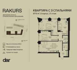 Продаётся 3-комнатная квартира 87.10 м² в жилом комплексе Ракурс. Квартиру отличают панорамное остекление, потолки 2,9 м, улучшенная шумо и воздухоизоляция. Дом сдаётся в 1 квартале 2028 года, продажи проходят через эскроусчета. Подземный паркинг, коворкинг, закрытая благоустроенная территория с фонтаном и артобъектами. Гибкие условия покупки.