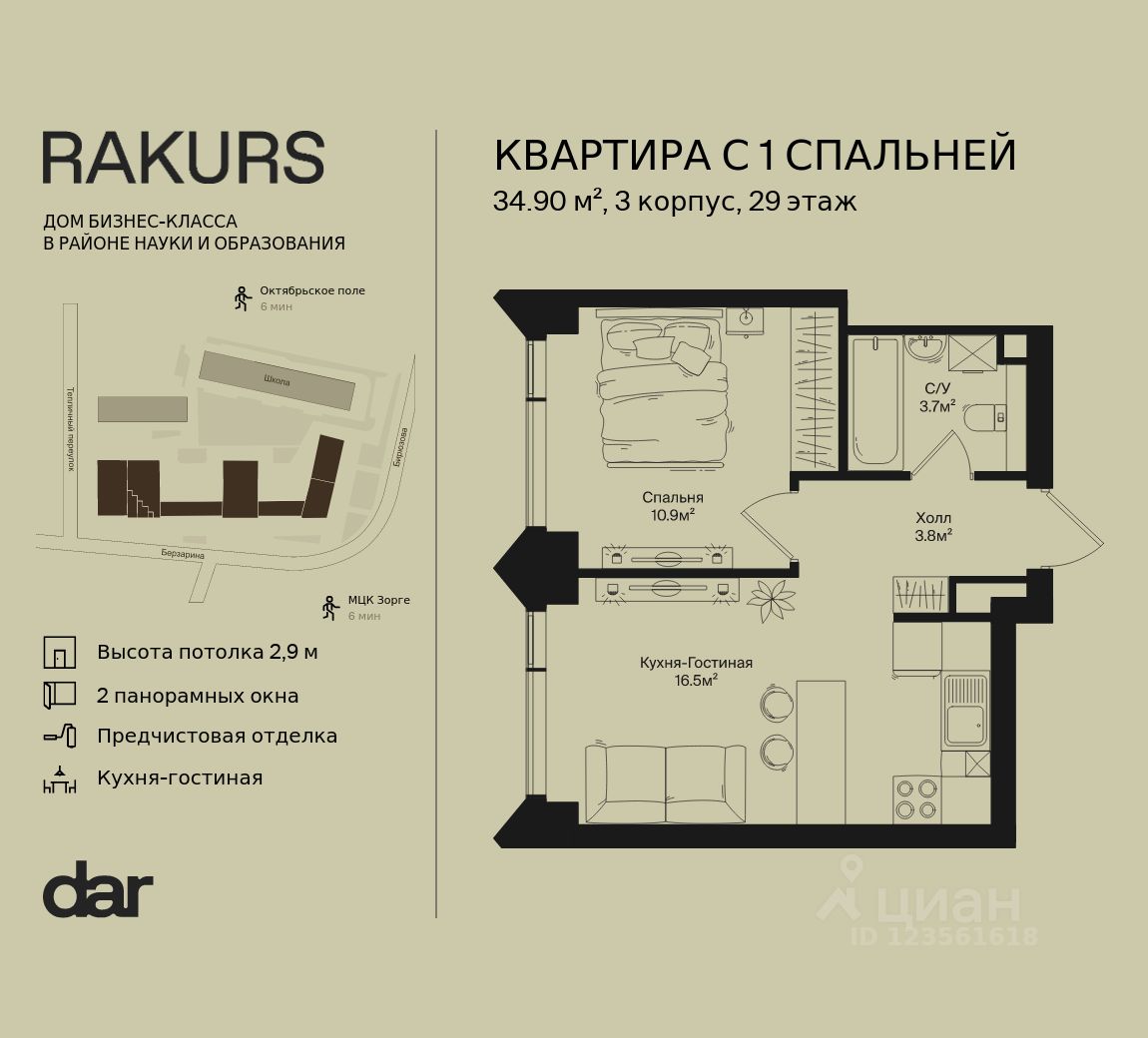 Продаётся 1-комнатная квартира 34.90 м² в жилом комплексе Ракурс. Квартиру отличают панорамное остекление, потолки 2,9 м, улучшенная шумо и воздухоизоляция. Дом сдаётся в 1 квартале 2028 года, продажи проходят через эскроусчета. Подземный паркинг, коворкинг, закрытая благоустроенная территория с фонтаном и артобъектами. Гибкие условия покупки. Rakurs — место, в котором жизнь приглашает к исследованию. Концепция проекта knowledge-centric среда, которая выражается здесь в образе жизни: • атмосфере интеллектуальной среды, • доступности образования, • фокусе на возможности для развития. RAKURS разместился в районе науки и окружен исследовательскими институтами и образовательными учреждениями, при этом на территории построена своя школа с уникальной концепцией. Расположенный на пересечении улиц Маршала Бирюзова и Берзарина, недалеко от станций метро "Октябрьское поле" и "Зорге", дом угождает транспортной доступностью автомобилистам и пешеходам. Инфраструктура же района создана с заботой о людях: здесь много парков, кафе и других уютных мест для отдыха. В состав комплекса входят три башни высотой 18, 26 и 44 этажа, каждая из которых имеет свой запоминающийся силуэт. Между собой башни связаны среднеэтажными строениями с индивидуальными фасадами. Композиция и пластика корпусов, а также панорамное остекление башен обеспечивают квартиры максимальным количеством дневного света и выигрышными видами на центр города и Москву-Сити. Упор на функциональность не лишает проект его уникального образа — все башни имеют неординарную форму с харизматичными уступами и консолями. Rakurs предлагает широкий выбор уникальных вариантов жилья — от студий до эксклюзивных квартир с приватными террасами. Проект спроектирован с фокусом на биофильность и функциональность. Во дворах Rakurs можно насладиться завтраком на террасе кафе, игрой с детьми или спортом на свежем воздухе. В Rakurse cвой комьюнити-центр - многофункциональное пространство для работы, отдыха, общения и развития. Одна из важнейших частей центра — частная библиотека с лаундж-зоной. Книжный фонд отбирается для нее кураторской командой, а дизайн пространства сделан так, чтобы жители могли почувствовать умиротворяющую атмосферу библиотечного зала. Идея knowledge-centric среды поддерживается здесь и книжным магазином с лекторием, а также зонами для самостоятельной учебы и занятий с преподавателями.