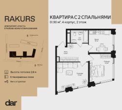 Продаётся 2-комнатная квартира 51.90 м² в жилом комплексе Ракурс. Квартиру отличают панорамное остекление, потолки [ceiling_height] м, улучшенная шумо и воздухоизоляция. Дом сдаётся в 1 квартале 2028 года, продажи проходят через эскроусчета. Подземный паркинг, коворкинг, закрытая благоустроенная территория с фонтаном и артобъектами. Гибкие условия покупки.