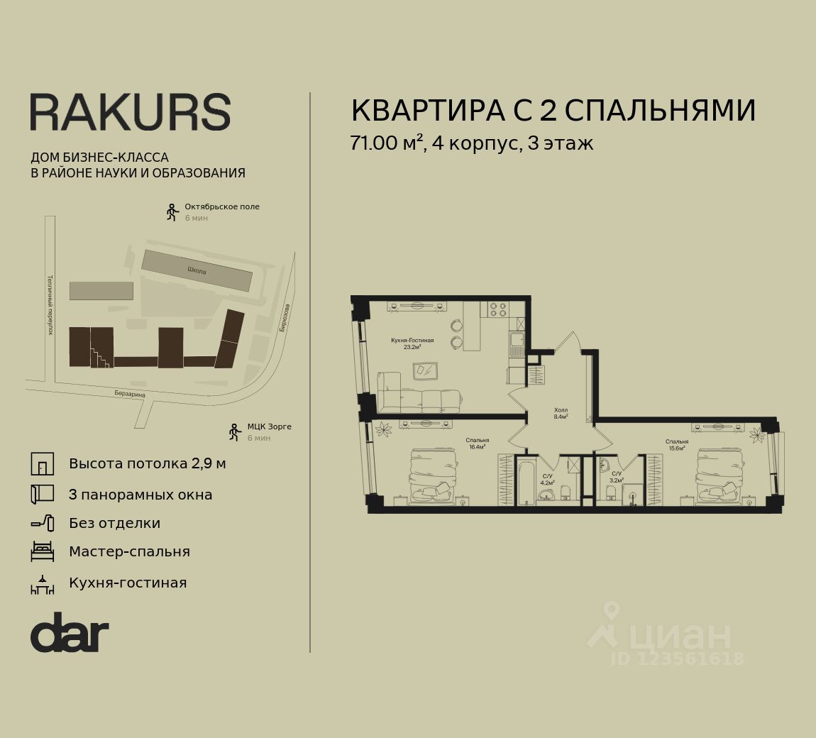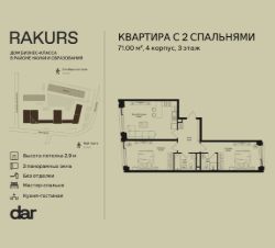 Продаётся 2-комнатная квартира 71.00 м² в жилом комплексе Ракурс. Квартиру отличают панорамное остекление, потолки 2,9 м, улучшенная шумо и воздухоизоляция. Дом сдаётся в 1 квартале 2028 года, продажи проходят через эскроусчета. Подземный паркинг, коворкинг, закрытая благоустроенная территория с фонтаном и артобъектами. Гибкие условия покупки.