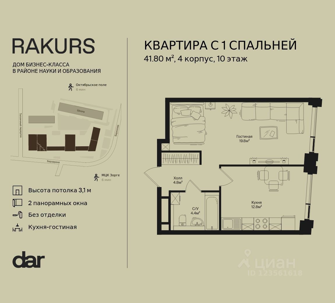 RAKURS разместился в районе науки и окружен исследовательскими институтами и образовательными учреждениями, при этом на территории построена своя школа с уникальной концепцией. Расположенный на пересечении улиц Маршала Бирюзова и Берзарина, недалеко от станций метро "Октябрьское поле" и "Зорге", дом угождает транспортной доступностью автомобилистам и пешеходам. Инфраструктура же района создана с заботой о людях: здесь много парков, кафе и других уютных мест для отдыха.