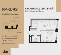 Продаётся 1-комнатная квартира 41.80 м² в жилом комплексе Ракурс. Квартиру отличают панорамное остекление, потолки 3,1 м, улучшенная шумо и воздухоизоляция. Дом сдаётся в 1 квартале 2028 года, продажи проходят через эскроусчета. Подземный паркинг, коворкинг, закрытая благоустроенная территория с фонтаном и артобъектами. Гибкие условия покупки.