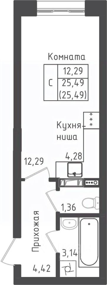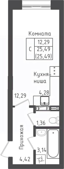 Студия, 25,49 м²
