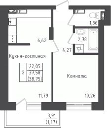Продаётся 1-комнатная квартира в строящемся доме (Дом 1), срок сдачи: I-кв. 2026, общей площадью 38.51 кв.м., на 2 этаже. Квартал жилой застройки "Зеленый Оазис-Город"