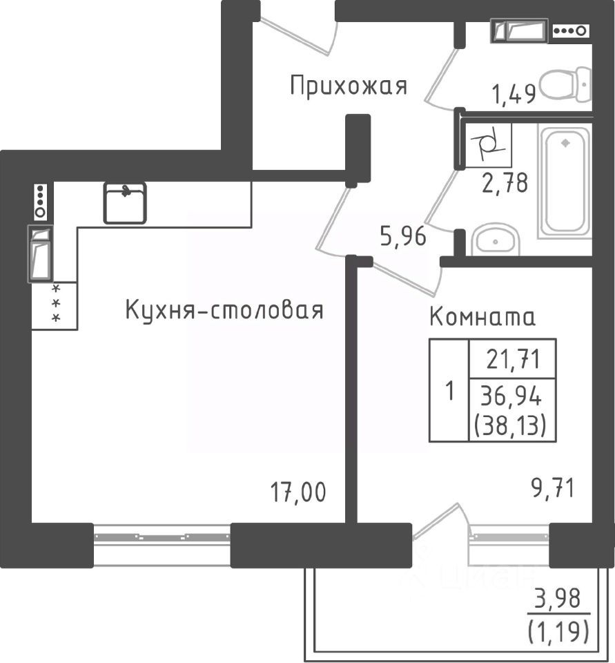 1-комн. квартира, 37,89 м²