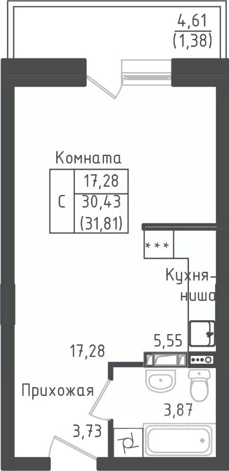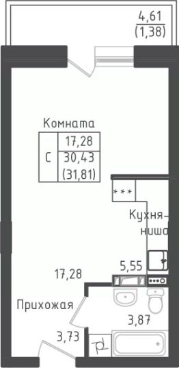Студия, 31,53 м²