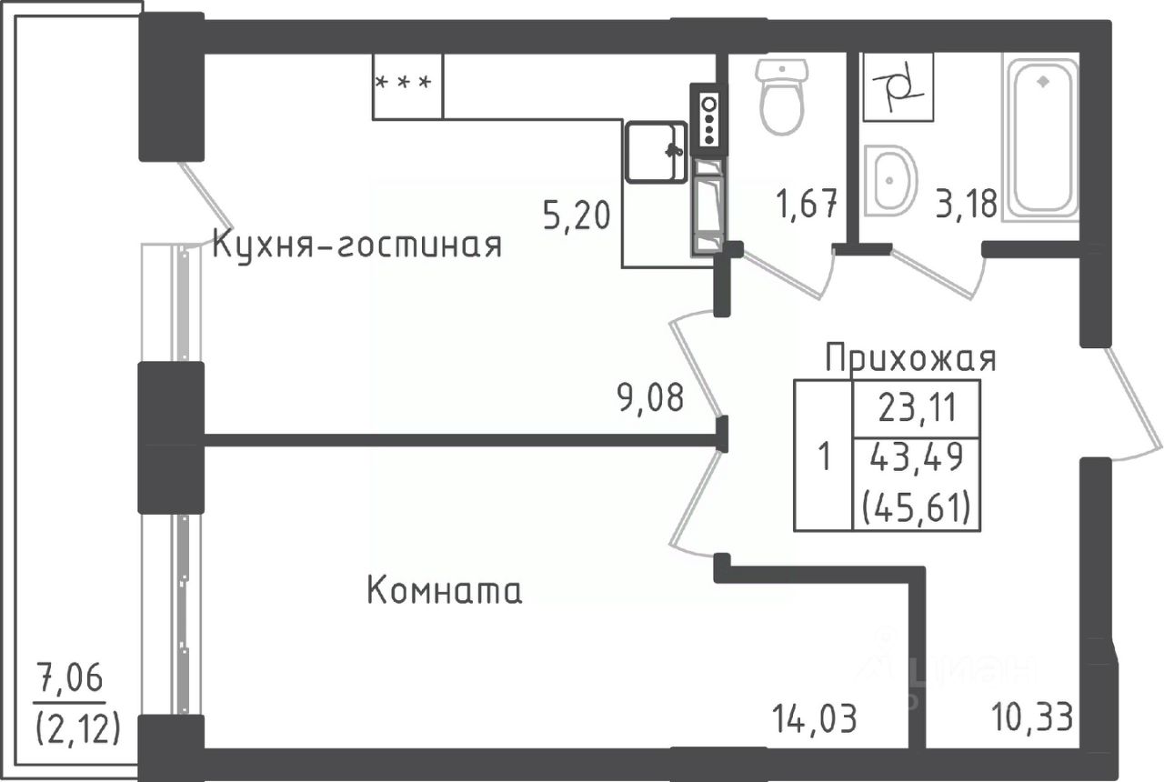 1-комн. квартира, 45,18 м²