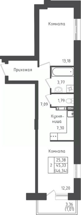 Продаётся 1-комнатная квартира в строящемся доме (Дом 1), срок сдачи: I-кв. 2026, общей площадью 46.12 кв.м., на 2 этаже. Квартал жилой застройки "Зеленый Оазис-Город"