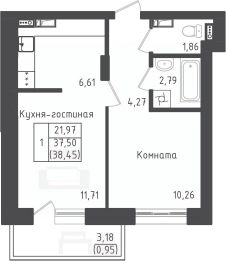 Продаётся 1-комнатная квартира в строящемся доме (Дом 1), срок сдачи: I-кв. 2026, общей площадью 38.45 кв.м., на 2 этаже. Квартал жилой застройки "Зеленый Оазис-Город"