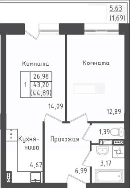 Продаётся 1-комнатная квартира в строящемся доме (Дом 1), срок сдачи: I-кв. 2026, общей площадью 44.89 кв.м., на 5 этаже. Квартал жилой застройки "Зеленый Оазис-Город"