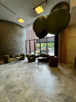На первом этаже кроме стойки консьержа, зона отдыха, гостевой сан узел, помывочная для лап собак. В коммерческом крыле расположатся продуктовые магазины, кофейня, салон красоты, так же ведутся переговоры по открытию фитнесс клуба.