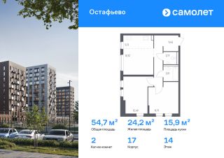 Предлагается 2-комнатная квартира комфорт-класса 54,69 кв.м в корпусе 17 на 14 этаже, в ЖК "Остафьево"