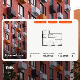 Продаётся 2-комн. квартира площадью 62,3 кв.м на 2 этаже 24 этажного дома (Корпус 6.2, Секция 1) проекта ПИК Волжский парк. Светлый просторный подъезд на уровне земли, функциональная планировка, большие окна, c отделкой.