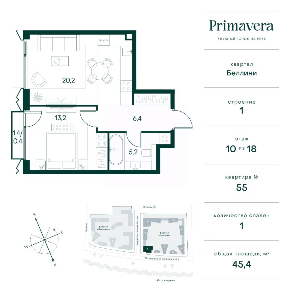 Клубный город на реке Primavera — это современный жилой комплекс премиум-класса, расположенный на первой береговой линии Москвы-реки в экологически чистом районе Покровское-Стрешнево. Под панорамными окнами квартир находится собственный экопарк с продуманной сетью прогулочных дорожек и современными детскими и спортивными площадками. За парком расположена набережная с собственным пляжем и зонами для отдыха. Клубный город на реке Primavera предлагает широкий выбор планировок для различных жизненных сценариев: от просторных однокомнатных квартир до пентхаусов и жилых помещений с террасами и патио. Выберите из 120 вариантов эргономичных планировок стандартного и евроформата. Из каждой квартиры открываются красивые виды на реку с углом обзора в 270 градусов. Дизайнерские лобби предлагают панорамный обзор на благоустроенный двор. Высокие потолки в 6 метров и качественная отделка создают атмосферу, схожую с пятизвездочными отелями. В Primavera есть всё необходимое для комфортной жизни в мегаполисе: • Образование для детей в шаговой доступности: 4 школы, 8 детских садов и развивающие центры с кружками и секциями. • Удобства на расстоянии приятной прогулки: супермаркеты, кафе, рестораны с верандами, салоны красоты, аптеки и многофункциональный центр для шоппинга и развлечений. • Умный дом: автоматизированное бесконтактное управление основными системами доступа и безопасности через мобильное приложение. Клубный город на реке Primavera выгодно сочетает комфорт городской жизни с близостью к природе. Живите в месте, где все создано для вашего удобства!