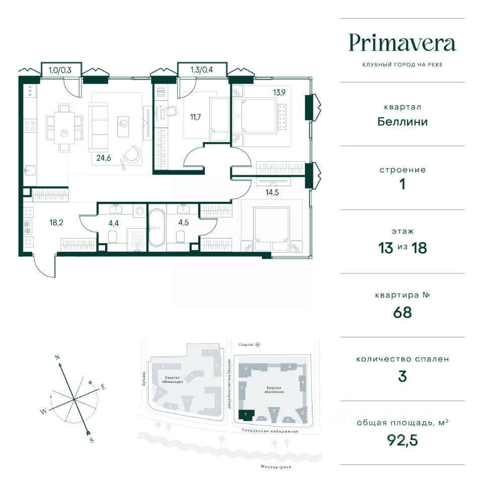 Клубный город на реке Primavera — это респектабельный проект премиум-класса на первой береговой линии Москвы-реки в экологически безупречном районе — Покровское-Стрешнево. Под панорамными окнами квартир расположился собственный экопарк, площадью 12 гектаров с сетью прогулочных дорожек, оборудованный детскими и спортивными площадками, а за ним набережная с собственным пляжем и зонами отдыха. Клубный город на реке Primavera предлагает впечатляющий выбор планировок для любого жизненного сценария: от просторных однокомнатных квартир до пентхаусов и квартир с видовыми террасами или патио. Выбирайте из 120 вариантов эргономичных планировок стандартного и евроформата. В проекте доступны квартиры площадью от 40 до 209 м², в каждой из которых открываются непревзойденные виды на реку, а угол обзора составляет 270 градусов. Из дизайнерских лобби открывается панорамный обзор на зеленый благоустроенный двор. Статусное мебелирование, потолки высотой 6 м и комфортная лаунж-зона отсылают к стилистике высококлассных пятизвездочных отелей. В Primavera есть все, что может предложить мегаполис, здесь все сосредоточено вокруг вас и настроено на ваши желания: - Всестороннее детское развитие в паре шагов от дома: 4 школы, 8 детских садов, развивающие центры с кружками и секциями. - Комфорт мегаполиса на расстоянии приятной прогулки: супермаркеты, кафе, рестораны с верандами на крыше, салоны красоты, аптеки, компании сферы услуг, многофункциональный центр для шоппинга и развлечений. - Умный дом: автоматизированное бесконтактное управление основными системами доступа, инфраструктуры и безопасности через мобильное приложение и специальные метки. Клубный город на реке Primavera выгодно отличается близостью к природе, совмещенной с насыщенной инфраструктурой.