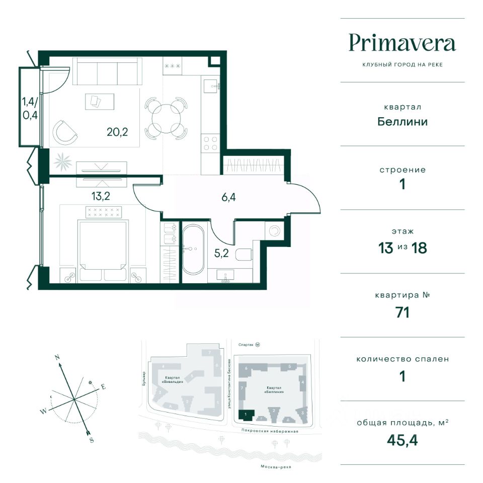 Клубный город на реке Primavera — это современный жилой комплекс премиум-класса, расположенный на первой береговой линии Москвы-реки в экологически чистом районе Покровское-Стрешнево. Под панорамными окнами квартир находится собственный экопарк с продуманной сетью прогулочных дорожек и современными детскими и спортивными площадками. За парком расположена набережная с собственным пляжем и зонами для отдыха. Клубный город на реке Primavera предлагает широкий выбор планировок для различных жизненных сценариев: от просторных однокомнатных квартир до пентхаусов и жилых помещений с террасами и патио. Выберите из 120 вариантов эргономичных планировок стандартного и евроформата. Из каждой квартиры открываются красивые виды на реку с углом обзора в 270 градусов. Дизайнерские лобби предлагают панорамный обзор на благоустроенный двор. Высокие потолки в 6 метров и качественная отделка создают атмосферу, схожую с пятизвездочными отелями. В Primavera есть всё необходимое для комфортной жизни в мегаполисе: • Образование для детей в шаговой доступности: 4 школы, 8 детских садов и развивающие центры с кружками и секциями. • Удобства на расстоянии приятной прогулки: супермаркеты, кафе, рестораны с верандами, салоны красоты, аптеки и многофункциональный центр для шоппинга и развлечений. • Умный дом: автоматизированное бесконтактное управление основными системами доступа и безопасности через мобильное приложение. Клубный город на реке Primavera выгодно сочетает комфорт городской жизни с близостью к природе. Живите в месте, где все создано для вашего удобства!