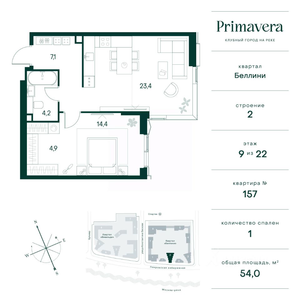 Клубный город на реке Primavera — это респектабельный проект премиум-класса на первой береговой линии Москвы-реки в экологически безупречном районе — Покровское-Стрешнево. Под панорамными окнами квартир расположился собственный экопарк, площадью 12 гектаров с сетью прогулочных дорожек, оборудованный детскими и спортивными площадками, а за ним набережная с собственным пляжем и зонами отдыха. Клубный город на реке Primavera предлагает впечатляющий выбор планировок для любого жизненного сценария: от просторных однокомнатных квартир до пентхаусов и квартир с видовыми террасами или патио. Выбирайте из 120 вариантов эргономичных планировок стандартного и евроформата. В проекте доступны квартиры площадью от 40 до 209 м², в каждой из которых открываются непревзойденные виды на реку, а угол обзора составляет 270 градусов. Из дизайнерских лобби открывается панорамный обзор на зеленый благоустроенный двор. Статусное мебелирование, потолки высотой 6 м и комфортная лаунж-зона отсылают к стилистике высококлассных пятизвездочных отелей. В Primavera есть все, что может предложить мегаполис, здесь все сосредоточено вокруг вас и настроено на ваши желания: - Всестороннее детское развитие в паре шагов от дома: 4 школы, 8 детских садов, развивающие центры с кружками и секциями. - Комфорт мегаполиса на расстоянии приятной прогулки: супермаркеты, кафе, рестораны с верандами на крыше, салоны красоты, аптеки, компании сферы услуг, многофункциональный центр для шоппинга и развлечений. - Умный дом: автоматизированное бесконтактное управление основными системами доступа, инфраструктуры и безопасности через мобильное приложение и специальные метки. Клубный город на реке Primavera выгодно отличается близостью к природе, совмещенной с насыщенной инфраструктурой.