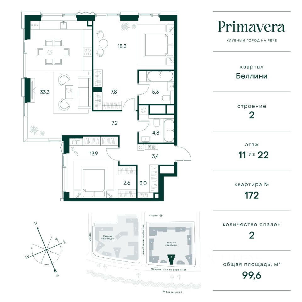 Клубный город на реке Primavera — это современный жилой комплекс премиум-класса, расположенный на первой береговой линии Москвы-реки в экологически чистом районе Покровское-Стрешнево. Под панорамными окнами квартир находится собственный экопарк с продуманной сетью прогулочных дорожек и современными детскими и спортивными площадками. За парком расположена набережная с собственным пляжем и зонами для отдыха. Клубный город на реке Primavera предлагает широкий выбор планировок для различных жизненных сценариев: от просторных однокомнатных квартир до пентхаусов и жилых помещений с террасами и патио. Выберите из 120 вариантов эргономичных планировок стандартного и евроформата. Из каждой квартиры открываются красивые виды на реку с углом обзора в 270 градусов. Дизайнерские лобби предлагают панорамный обзор на благоустроенный двор. Высокие потолки в 6 метров и качественная отделка создают атмосферу, схожую с пятизвездочными отелями. В Primavera есть всё необходимое для комфортной жизни в мегаполисе: • Образование для детей в шаговой доступности: 4 школы, 8 детских садов и развивающие центры с кружками и секциями. • Удобства на расстоянии приятной прогулки: супермаркеты, кафе, рестораны с верандами, салоны красоты, аптеки и многофункциональный центр для шоппинга и развлечений. • Умный дом: автоматизированное бесконтактное управление основными системами доступа и безопасности через мобильное приложение. Клубный город на реке Primavera выгодно сочетает комфорт городской жизни с близостью к природе. Живите в месте, где все создано для вашего удобства!