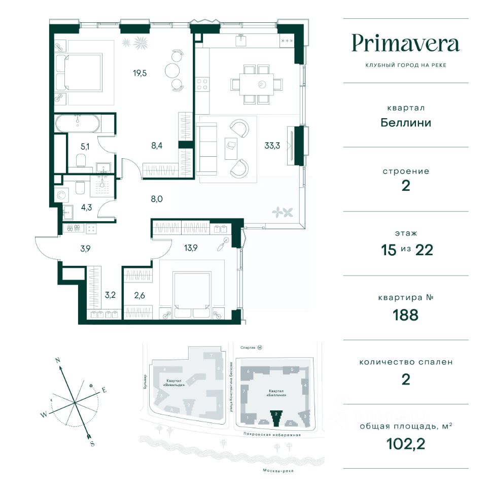 Клубный город на реке Primavera — это современный жилой комплекс премиум-класса, расположенный на первой береговой линии Москвы-реки в экологически чистом районе Покровское-Стрешнево. Под панорамными окнами квартир находится собственный экопарк с продуманной сетью прогулочных дорожек и современными детскими и спортивными площадками. За парком расположена набережная с собственным пляжем и зонами для отдыха. Клубный город на реке Primavera предлагает широкий выбор планировок для различных жизненных сценариев: от просторных однокомнатных квартир до пентхаусов и жилых помещений с террасами и патио. Выберите из 120 вариантов эргономичных планировок стандартного и евроформата. Из каждой квартиры открываются красивые виды на реку с углом обзора в 270 градусов. Дизайнерские лобби предлагают панорамный обзор на благоустроенный двор. Высокие потолки в 6 метров и качественная отделка создают атмосферу, схожую с пятизвездочными отелями. В Primavera есть всё необходимое для комфортной жизни в мегаполисе: • Образование для детей в шаговой доступности: 4 школы, 8 детских садов и развивающие центры с кружками и секциями. • Удобства на расстоянии приятной прогулки: супермаркеты, кафе, рестораны с верандами, салоны красоты, аптеки и многофункциональный центр для шоппинга и развлечений. • Умный дом: автоматизированное бесконтактное управление основными системами доступа и безопасности через мобильное приложение. Клубный город на реке Primavera выгодно сочетает комфорт городской жизни с близостью к природе. Живите в месте, где все создано для вашего удобства!