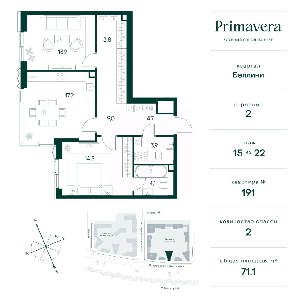 Клубный город на реке Primavera — это современный жилой комплекс премиум-класса, расположенный на первой береговой линии Москвы-реки в экологически чистом районе Покровское-Стрешнево. Под панорамными окнами квартир находится собственный экопарк с продуманной сетью прогулочных дорожек и современными детскими и спортивными площадками. За парком расположена набережная с собственным пляжем и зонами для отдыха. Клубный город на реке Primavera предлагает широкий выбор планировок для различных жизненных сценариев: от просторных однокомнатных квартир до пентхаусов и жилых помещений с террасами и патио. Выберите из 120 вариантов эргономичных планировок стандартного и евроформата. Из каждой квартиры открываются красивые виды на реку с углом обзора в 270 градусов. Дизайнерские лобби предлагают панорамный обзор на благоустроенный двор. Высокие потолки в 6 метров и качественная отделка создают атмосферу, схожую с пятизвездочными отелями. В Primavera есть всё необходимое для комфортной жизни в мегаполисе: • Образование для детей в шаговой доступности: 4 школы, 8 детских садов и развивающие центры с кружками и секциями. • Удобства на расстоянии приятной прогулки: супермаркеты, кафе, рестораны с верандами, салоны красоты, аптеки и многофункциональный центр для шоппинга и развлечений. • Умный дом: автоматизированное бесконтактное управление основными системами доступа и безопасности через мобильное приложение. Клубный город на реке Primavera выгодно сочетает комфорт городской жизни с близостью к природе. Живите в месте, где все создано для вашего удобства!
