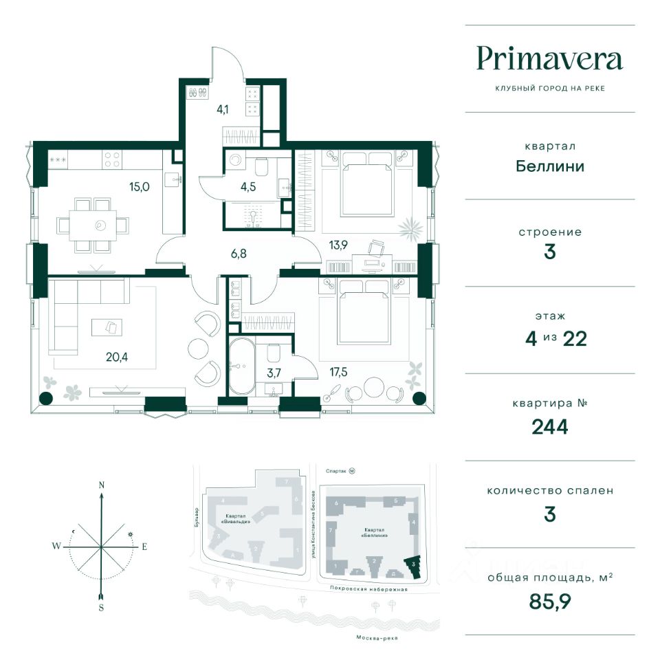Клубный город на реке Primavera — это респектабельный проект премиум-класса на первой береговой линии Москвы-реки в экологически безупречном районе — Покровское-Стрешнево. Под панорамными окнами квартир расположился собственный экопарк, площадью 12 гектаров с сетью прогулочных дорожек, оборудованный детскими и спортивными площадками, а за ним набережная с собственным пляжем и зонами отдыха. Клубный город на реке Primavera предлагает впечатляющий выбор планировок для любого жизненного сценария: от просторных однокомнатных квартир до пентхаусов и квартир с видовыми террасами или патио. Выбирайте из 120 вариантов эргономичных планировок стандартного и евроформата. В проекте доступны квартиры площадью от 40 до 209 м², в каждой из которых открываются непревзойденные виды на реку, а угол обзора составляет 270 градусов. Из дизайнерских лобби открывается панорамный обзор на зеленый благоустроенный двор. Статусное мебелирование, потолки высотой 6 м и комфортная лаунж-зона отсылают к стилистике высококлассных пятизвездочных отелей. В Primavera есть все, что может предложить мегаполис, здесь все сосредоточено вокруг вас и настроено на ваши желания: - Всестороннее детское развитие в паре шагов от дома: 4 школы, 8 детских садов, развивающие центры с кружками и секциями. - Комфорт мегаполиса на расстоянии приятной прогулки: супермаркеты, кафе, рестораны с верандами на крыше, салоны красоты, аптеки, компании сферы услуг, многофункциональный центр для шоппинга и развлечений. - Умный дом: автоматизированное бесконтактное управление основными системами доступа, инфраструктуры и безопасности через мобильное приложение и специальные метки. Клубный город на реке Primavera выгодно отличается близостью к природе, совмещенной с насыщенной инфраструктурой.