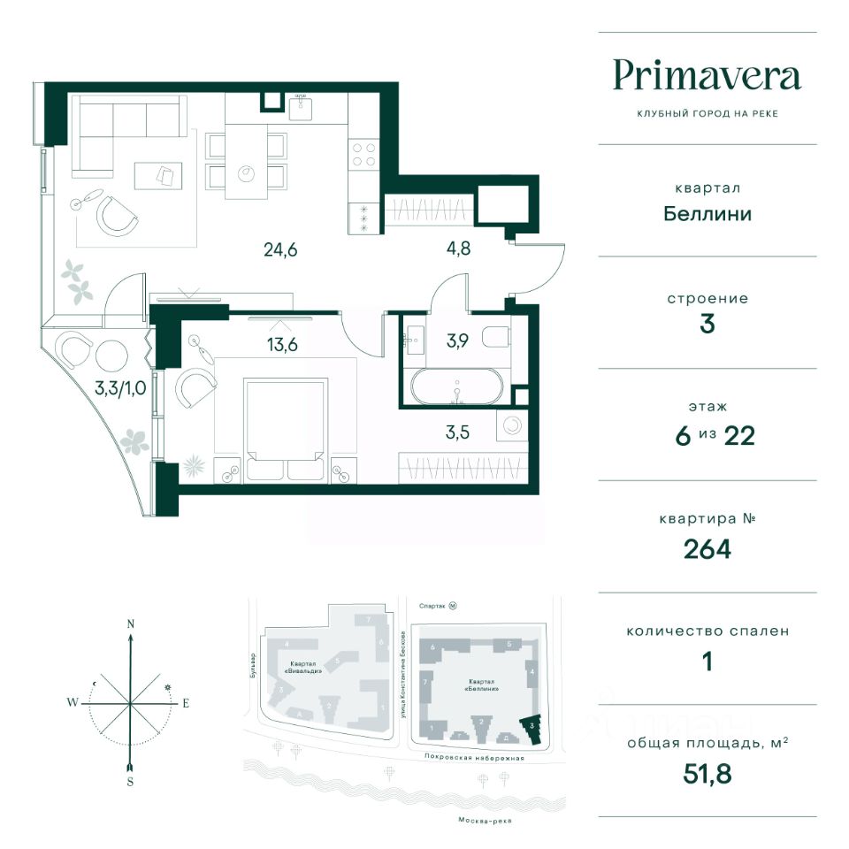 Клубный город на реке Primavera — это современный жилой комплекс премиум-класса, расположенный на первой береговой линии Москвы-реки в экологически чистом районе Покровское-Стрешнево. Под панорамными окнами квартир находится собственный экопарк с продуманной сетью прогулочных дорожек и современными детскими и спортивными площадками. За парком расположена набережная с собственным пляжем и зонами для отдыха. Клубный город на реке Primavera предлагает широкий выбор планировок для различных жизненных сценариев: от просторных однокомнатных квартир до пентхаусов и жилых помещений с террасами и патио. Выберите из 120 вариантов эргономичных планировок стандартного и евроформата. Из каждой квартиры открываются красивые виды на реку с углом обзора в 270 градусов. Дизайнерские лобби предлагают панорамный обзор на благоустроенный двор. Высокие потолки в 6 метров и качественная отделка создают атмосферу, схожую с пятизвездочными отелями. В Primavera есть всё необходимое для комфортной жизни в мегаполисе: • Образование для детей в шаговой доступности: 4 школы, 8 детских садов и развивающие центры с кружками и секциями. • Удобства на расстоянии приятной прогулки: супермаркеты, кафе, рестораны с верандами, салоны красоты, аптеки и многофункциональный центр для шоппинга и развлечений. • Умный дом: автоматизированное бесконтактное управление основными системами доступа и безопасности через мобильное приложение. Клубный город на реке Primavera выгодно сочетает комфорт городской жизни с близостью к природе. Живите в месте, где все создано для вашего удобства!