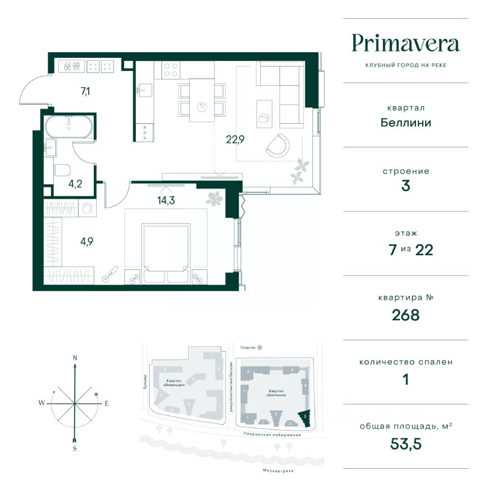 Клубный город на реке Primavera — это современный жилой комплекс премиум-класса, расположенный на первой береговой линии Москвы-реки в экологически чистом районе Покровское-Стрешнево. Под панорамными окнами квартир находится собственный экопарк с продуманной сетью прогулочных дорожек и современными детскими и спортивными площадками. За парком расположена набережная с собственным пляжем и зонами для отдыха. Клубный город на реке Primavera предлагает широкий выбор планировок для различных жизненных сценариев: от просторных однокомнатных квартир до пентхаусов и жилых помещений с террасами и патио. Выберите из 120 вариантов эргономичных планировок стандартного и евроформата. Из каждой квартиры открываются красивые виды на реку с углом обзора в 270 градусов. Дизайнерские лобби предлагают панорамный обзор на благоустроенный двор. Высокие потолки в 6 метров и качественная отделка создают атмосферу, схожую с пятизвездочными отелями. В Primavera есть всё необходимое для комфортной жизни в мегаполисе: • Образование для детей в шаговой доступности: 4 школы, 8 детских садов и развивающие центры с кружками и секциями. • Удобства на расстоянии приятной прогулки: супермаркеты, кафе, рестораны с верандами, салоны красоты, аптеки и многофункциональный центр для шоппинга и развлечений. • Умный дом: автоматизированное бесконтактное управление основными системами доступа и безопасности через мобильное приложение. Клубный город на реке Primavera выгодно сочетает комфорт городской жизни с близостью к природе. Живите в месте, где все создано для вашего удобства!