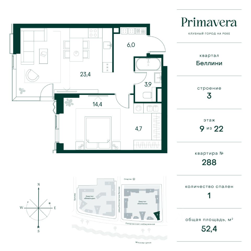 Клубный город на реке Primavera — это респектабельный проект премиум-класса на первой береговой линии Москвы-реки в экологически безупречном районе — Покровское-Стрешнево. Под панорамными окнами квартир расположился собственный экопарк, площадью 12 гектаров с сетью прогулочных дорожек, оборудованный детскими и спортивными площадками, а за ним набережная с собственным пляжем и зонами отдыха. Клубный город на реке Primavera предлагает впечатляющий выбор планировок для любого жизненного сценария: от просторных однокомнатных квартир до пентхаусов и квартир с видовыми террасами или патио. Выбирайте из 120 вариантов эргономичных планировок стандартного и евроформата. В проекте доступны квартиры площадью от 40 до 209 м², в каждой из которых открываются непревзойденные виды на реку, а угол обзора составляет 270 градусов. Из дизайнерских лобби открывается панорамный обзор на зеленый благоустроенный двор. Статусное мебелирование, потолки высотой 6 м и комфортная лаунж-зона отсылают к стилистике высококлассных пятизвездочных отелей. В Primavera есть все, что может предложить мегаполис, здесь все сосредоточено вокруг вас и настроено на ваши желания: - Всестороннее детское развитие в паре шагов от дома: 4 школы, 8 детских садов, развивающие центры с кружками и секциями. - Комфорт мегаполиса на расстоянии приятной прогулки: супермаркеты, кафе, рестораны с верандами на крыше, салоны красоты, аптеки, компании сферы услуг, многофункциональный центр для шоппинга и развлечений. - Умный дом: автоматизированное бесконтактное управление основными системами доступа, инфраструктуры и безопасности через мобильное приложение и специальные метки. Клубный город на реке Primavera выгодно отличается близостью к природе, совмещенной с насыщенной инфраструктурой.