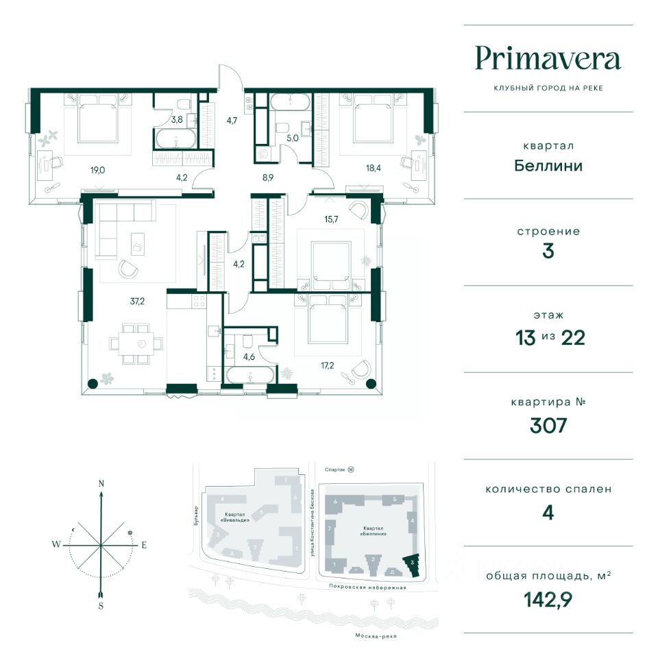 Клубный город на реке Primavera — это респектабельный проект премиум-класса на первой береговой линии Москвы-реки в экологически безупречном районе — Покровское-Стрешнево. Под панорамными окнами квартир расположился собственный экопарк, площадью 12 гектаров с сетью прогулочных дорожек, оборудованный детскими и спортивными площадками, а за ним набережная с собственным пляжем и зонами отдыха. Клубный город на реке Primavera предлагает впечатляющий выбор планировок для любого жизненного сценария: от просторных однокомнатных квартир до пентхаусов и квартир с видовыми террасами или патио. Выбирайте из 120 вариантов эргономичных планировок стандартного и евроформата. В проекте доступны квартиры площадью от 40 до 209 м², в каждой из которых открываются непревзойденные виды на реку, а угол обзора составляет 270 градусов. Из дизайнерских лобби открывается панорамный обзор на зеленый благоустроенный двор. Статусное мебелирование, потолки высотой 6 м и комфортная лаунж-зона отсылают к стилистике высококлассных пятизвездочных отелей. В Primavera есть все, что может предложить мегаполис, здесь все сосредоточено вокруг вас и настроено на ваши желания: - Всестороннее детское развитие в паре шагов от дома: 4 школы, 8 детских садов, развивающие центры с кружками и секциями. - Комфорт мегаполиса на расстоянии приятной прогулки: супермаркеты, кафе, рестораны с верандами на крыше, салоны красоты, аптеки, компании сферы услуг, многофункциональный центр для шоппинга и развлечений. - Умный дом: автоматизированное бесконтактное управление основными системами доступа, инфраструктуры и безопасности через мобильное приложение и специальные метки. Клубный город на реке Primavera выгодно отличается близостью к природе, совмещенной с насыщенной инфраструктурой.