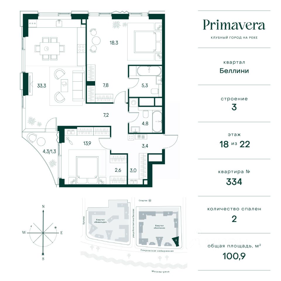 Клубный город на реке Primavera — это современный жилой комплекс премиум-класса, расположенный на первой береговой линии Москвы-реки в экологически чистом районе Покровское-Стрешнево. Под панорамными окнами квартир находится собственный экопарк с продуманной сетью прогулочных дорожек и современными детскими и спортивными площадками. За парком расположена набережная с собственным пляжем и зонами для отдыха. Клубный город на реке Primavera предлагает широкий выбор планировок для различных жизненных сценариев: от просторных однокомнатных квартир до пентхаусов и жилых помещений с террасами и патио. Выберите из 120 вариантов эргономичных планировок стандартного и евроформата. Из каждой квартиры открываются красивые виды на реку с углом обзора в 270 градусов. Дизайнерские лобби предлагают панорамный обзор на благоустроенный двор. Высокие потолки в 6 метров и качественная отделка создают атмосферу, схожую с пятизвездочными отелями. В Primavera есть всё необходимое для комфортной жизни в мегаполисе: • Образование для детей в шаговой доступности: 4 школы, 8 детских садов и развивающие центры с кружками и секциями. • Удобства на расстоянии приятной прогулки: супермаркеты, кафе, рестораны с верандами, салоны красоты, аптеки и многофункциональный центр для шоппинга и развлечений. • Умный дом: автоматизированное бесконтактное управление основными системами доступа и безопасности через мобильное приложение. Клубный город на реке Primavera выгодно сочетает комфорт городской жизни с близостью к природе. Живите в месте, где все создано для вашего удобства!