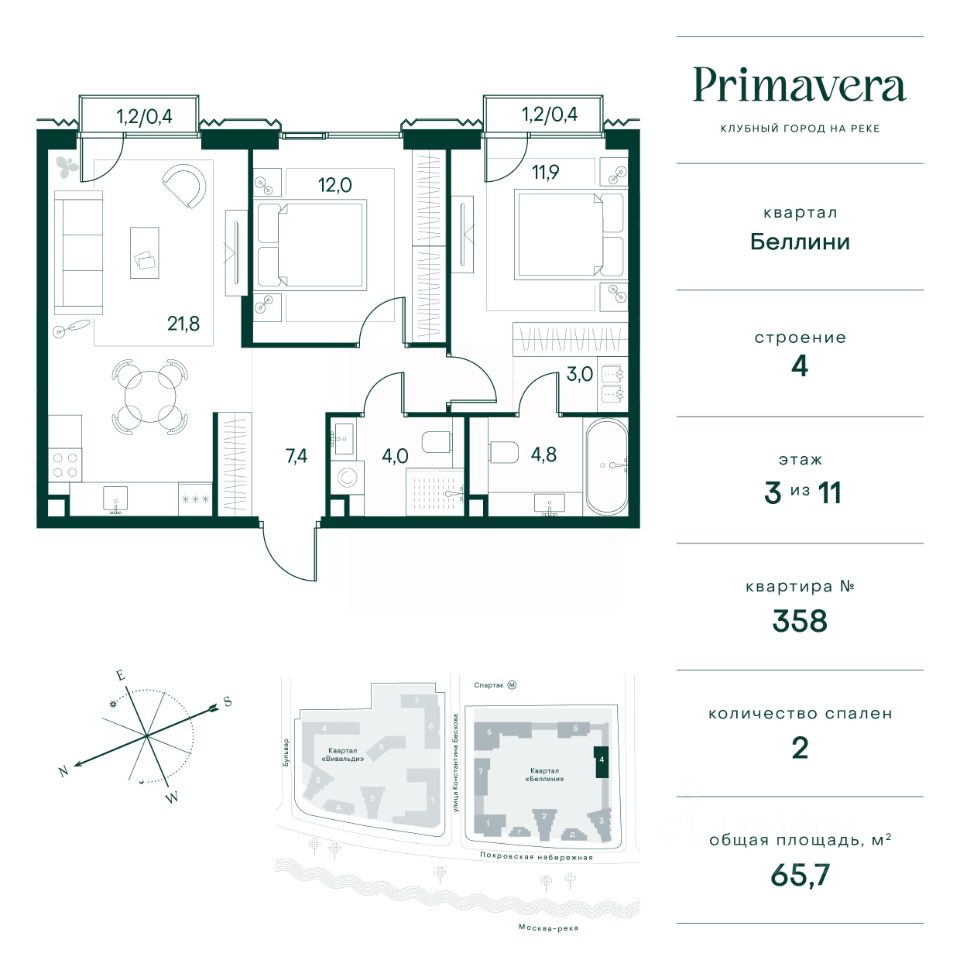Клубный город на реке Primavera — это современный жилой комплекс премиум-класса, расположенный на первой береговой линии Москвы-реки в экологически чистом районе Покровское-Стрешнево. Под панорамными окнами квартир находится собственный экопарк с продуманной сетью прогулочных дорожек и современными детскими и спортивными площадками. За парком расположена набережная с собственным пляжем и зонами для отдыха. Клубный город на реке Primavera предлагает широкий выбор планировок для различных жизненных сценариев: от просторных однокомнатных квартир до пентхаусов и жилых помещений с террасами и патио. Выберите из 120 вариантов эргономичных планировок стандартного и евроформата. Из каждой квартиры открываются красивые виды на реку с углом обзора в 270 градусов. Дизайнерские лобби предлагают панорамный обзор на благоустроенный двор. Высокие потолки в 6 метров и качественная отделка создают атмосферу, схожую с пятизвездочными отелями. В Primavera есть всё необходимое для комфортной жизни в мегаполисе: • Образование для детей в шаговой доступности: 4 школы, 8 детских садов и развивающие центры с кружками и секциями. • Удобства на расстоянии приятной прогулки: супермаркеты, кафе, рестораны с верандами, салоны красоты, аптеки и многофункциональный центр для шоппинга и развлечений. • Умный дом: автоматизированное бесконтактное управление основными системами доступа и безопасности через мобильное приложение. Клубный город на реке Primavera выгодно сочетает комфорт городской жизни с близостью к природе. Живите в месте, где все создано для вашего удобства!