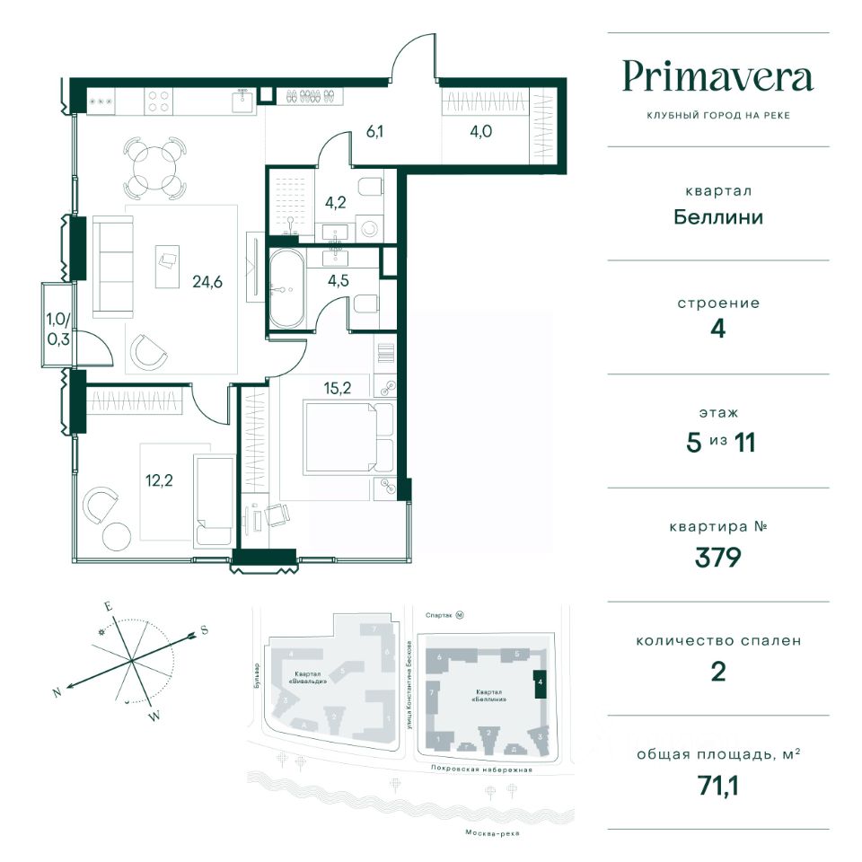 Клубный город на реке Primavera — это респектабельный проект премиум-класса на первой береговой линии Москвы-реки в экологически безупречном районе — Покровское-Стрешнево. Под панорамными окнами квартир расположился собственный экопарк, площадью 12 гектаров с сетью прогулочных дорожек, оборудованный детскими и спортивными площадками, а за ним набережная с собственным пляжем и зонами отдыха. Клубный город на реке Primavera предлагает впечатляющий выбор планировок для любого жизненного сценария: от просторных однокомнатных квартир до пентхаусов и квартир с видовыми террасами или патио. Выбирайте из 120 вариантов эргономичных планировок стандартного и евроформата. В проекте доступны квартиры площадью от 40 до 209 м², в каждой из которых открываются непревзойденные виды на реку, а угол обзора составляет 270 градусов. Из дизайнерских лобби открывается панорамный обзор на зеленый благоустроенный двор. Статусное мебелирование, потолки высотой 6 м и комфортная лаунж-зона отсылают к стилистике высококлассных пятизвездочных отелей. В Primavera есть все, что может предложить мегаполис, здесь все сосредоточено вокруг вас и настроено на ваши желания: - Всестороннее детское развитие в паре шагов от дома: 4 школы, 8 детских садов, развивающие центры с кружками и секциями. - Комфорт мегаполиса на расстоянии приятной прогулки: супермаркеты, кафе, рестораны с верандами на крыше, салоны красоты, аптеки, компании сферы услуг, многофункциональный центр для шоппинга и развлечений. - Умный дом: автоматизированное бесконтактное управление основными системами доступа, инфраструктуры и безопасности через мобильное приложение и специальные метки. Клубный город на реке Primavera выгодно отличается близостью к природе, совмещенной с насыщенной инфраструктурой.