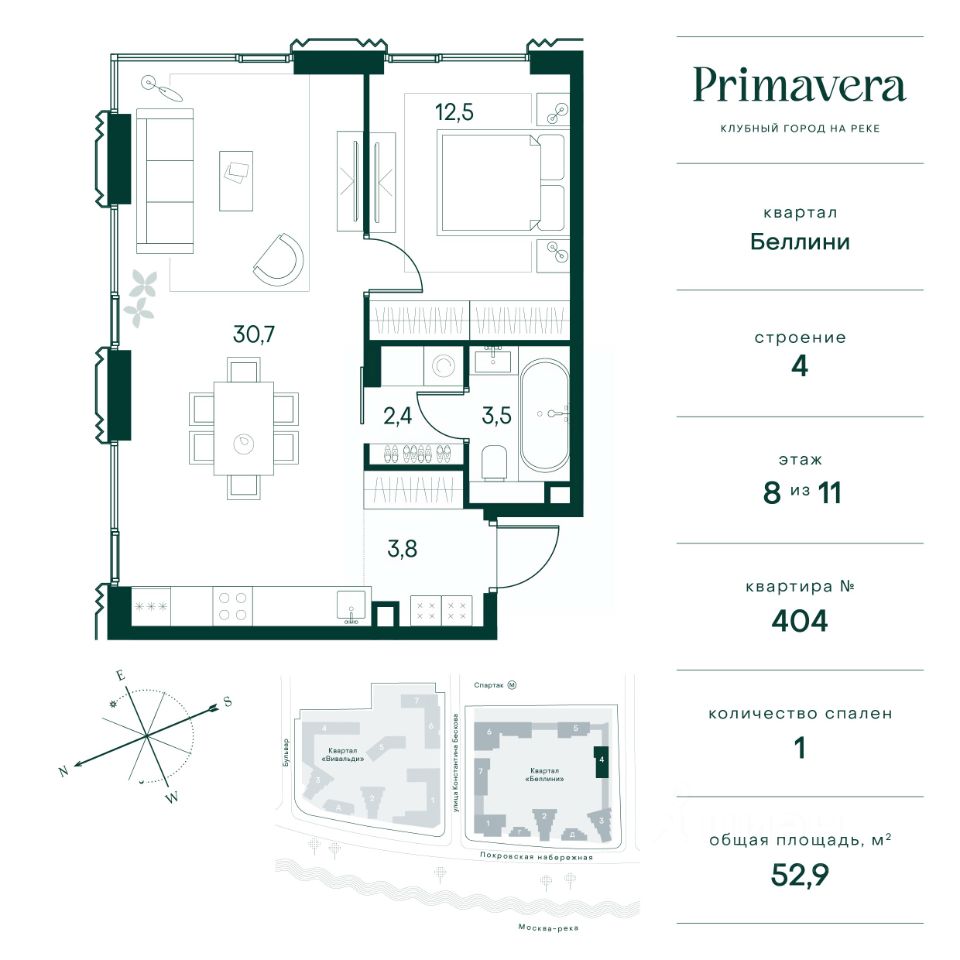 Клубный город на реке Primavera — это респектабельный проект премиум-класса на первой береговой линии Москвы-реки в экологически безупречном районе — Покровское-Стрешнево. Под панорамными окнами квартир расположился собственный экопарк, площадью 12 гектаров с сетью прогулочных дорожек, оборудованный детскими и спортивными площадками, а за ним набережная с собственным пляжем и зонами отдыха. Клубный город на реке Primavera предлагает впечатляющий выбор планировок для любого жизненного сценария: от просторных однокомнатных квартир до пентхаусов и квартир с видовыми террасами или патио. Выбирайте из 120 вариантов эргономичных планировок стандартного и евроформата. В проекте доступны квартиры площадью от 40 до 209 м², в каждой из которых открываются непревзойденные виды на реку, а угол обзора составляет 270 градусов. Из дизайнерских лобби открывается панорамный обзор на зеленый благоустроенный двор. Статусное мебелирование, потолки высотой 6 м и комфортная лаунж-зона отсылают к стилистике высококлассных пятизвездочных отелей. В Primavera есть все, что может предложить мегаполис, здесь все сосредоточено вокруг вас и настроено на ваши желания: - Всестороннее детское развитие в паре шагов от дома: 4 школы, 8 детских садов, развивающие центры с кружками и секциями. - Комфорт мегаполиса на расстоянии приятной прогулки: супермаркеты, кафе, рестораны с верандами на крыше, салоны красоты, аптеки, компании сферы услуг, многофункциональный центр для шоппинга и развлечений. - Умный дом: автоматизированное бесконтактное управление основными системами доступа, инфраструктуры и безопасности через мобильное приложение и специальные метки. Клубный город на реке Primavera выгодно отличается близостью к природе, совмещенной с насыщенной инфраструктурой.