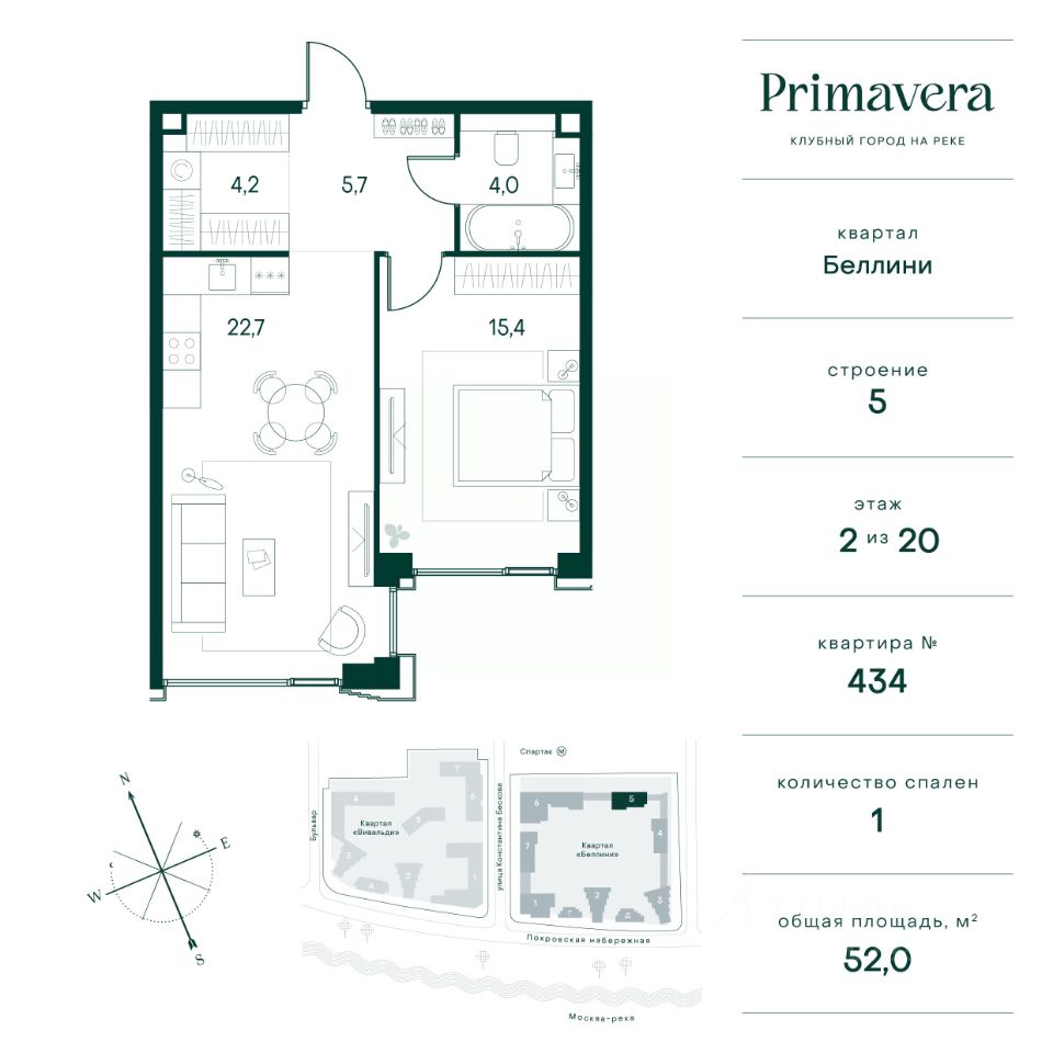 Клубный город на реке Primavera — это современный жилой комплекс премиум-класса, расположенный на первой береговой линии Москвы-реки в экологически чистом районе Покровское-Стрешнево. Под панорамными окнами квартир находится собственный экопарк с продуманной сетью прогулочных дорожек и современными детскими и спортивными площадками. За парком расположена набережная с собственным пляжем и зонами для отдыха. Клубный город на реке Primavera предлагает широкий выбор планировок для различных жизненных сценариев: от просторных однокомнатных квартир до пентхаусов и жилых помещений с террасами и патио. Выберите из 120 вариантов эргономичных планировок стандартного и евроформата. Из каждой квартиры открываются красивые виды на реку с углом обзора в 270 градусов. Дизайнерские лобби предлагают панорамный обзор на благоустроенный двор. Высокие потолки в 6 метров и качественная отделка создают атмосферу, схожую с пятизвездочными отелями. В Primavera есть всё необходимое для комфортной жизни в мегаполисе: • Образование для детей в шаговой доступности: 4 школы, 8 детских садов и развивающие центры с кружками и секциями. • Удобства на расстоянии приятной прогулки: супермаркеты, кафе, рестораны с верандами, салоны красоты, аптеки и многофункциональный центр для шоппинга и развлечений. • Умный дом: автоматизированное бесконтактное управление основными системами доступа и безопасности через мобильное приложение. Клубный город на реке Primavera выгодно сочетает комфорт городской жизни с близостью к природе. Живите в месте, где все создано для вашего удобства!