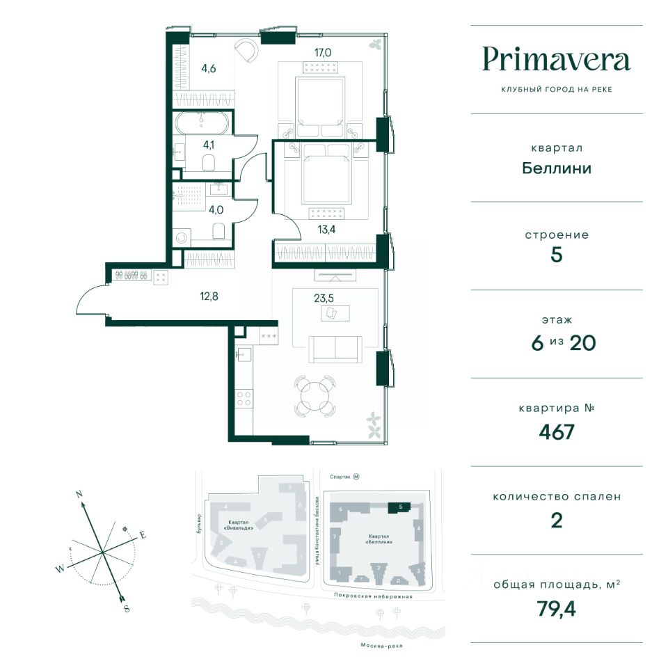 Клубный город на реке Primavera — это современный жилой комплекс премиум-класса, расположенный на первой береговой линии Москвы-реки в экологически чистом районе Покровское-Стрешнево. Под панорамными окнами квартир находится собственный экопарк с продуманной сетью прогулочных дорожек и современными детскими и спортивными площадками. За парком расположена набережная с собственным пляжем и зонами для отдыха. Клубный город на реке Primavera предлагает широкий выбор планировок для различных жизненных сценариев: от просторных однокомнатных квартир до пентхаусов и жилых помещений с террасами и патио. Выберите из 120 вариантов эргономичных планировок стандартного и евроформата. Из каждой квартиры открываются красивые виды на реку с углом обзора в 270 градусов. Дизайнерские лобби предлагают панорамный обзор на благоустроенный двор. Высокие потолки в 6 метров и качественная отделка создают атмосферу, схожую с пятизвездочными отелями. В Primavera есть всё необходимое для комфортной жизни в мегаполисе: • Образование для детей в шаговой доступности: 4 школы, 8 детских садов и развивающие центры с кружками и секциями. • Удобства на расстоянии приятной прогулки: супермаркеты, кафе, рестораны с верандами, салоны красоты, аптеки и многофункциональный центр для шоппинга и развлечений. • Умный дом: автоматизированное бесконтактное управление основными системами доступа и безопасности через мобильное приложение. Клубный город на реке Primavera выгодно сочетает комфорт городской жизни с близостью к природе. Живите в месте, где все создано для вашего удобства!