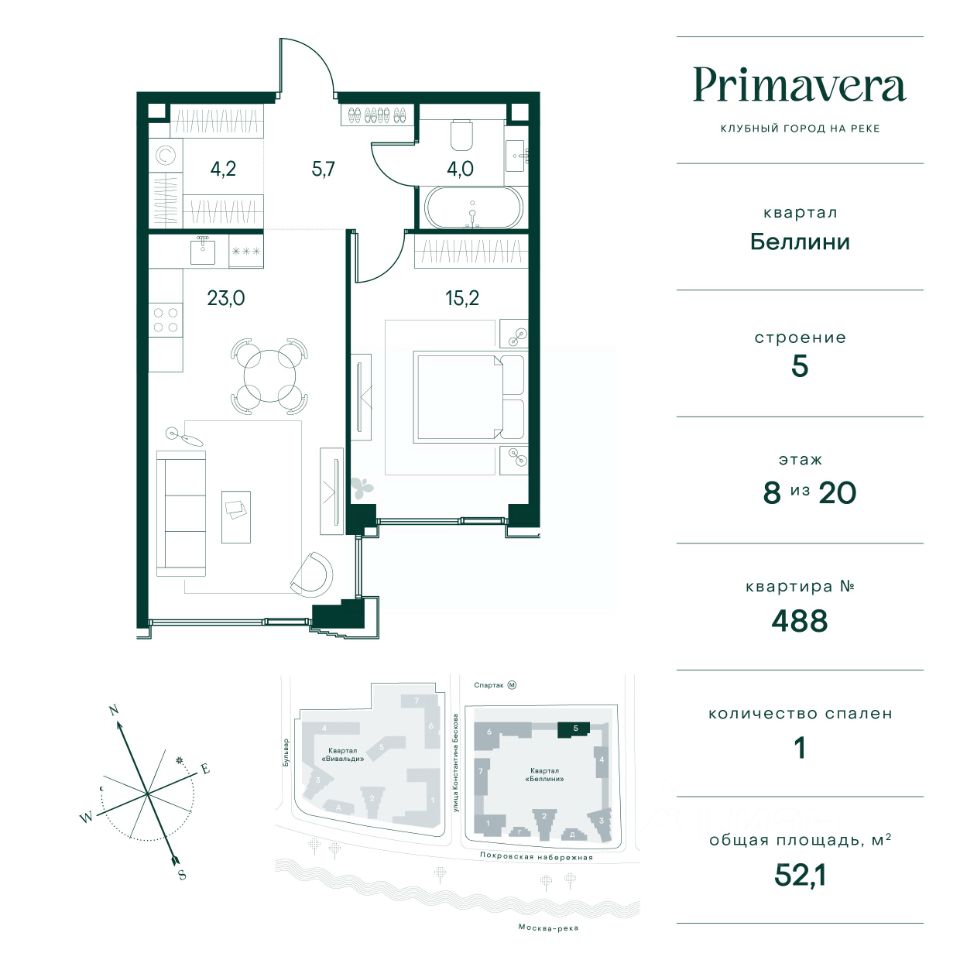 Клубный город на реке Primavera — это современный жилой комплекс премиум-класса, расположенный на первой береговой линии Москвы-реки в экологически чистом районе Покровское-Стрешнево. Под панорамными окнами квартир находится собственный экопарк с продуманной сетью прогулочных дорожек и современными детскими и спортивными площадками. За парком расположена набережная с собственным пляжем и зонами для отдыха. Клубный город на реке Primavera предлагает широкий выбор планировок для различных жизненных сценариев: от просторных однокомнатных квартир до пентхаусов и жилых помещений с террасами и патио. Выберите из 120 вариантов эргономичных планировок стандартного и евроформата. Из каждой квартиры открываются красивые виды на реку с углом обзора в 270 градусов. Дизайнерские лобби предлагают панорамный обзор на благоустроенный двор. Высокие потолки в 6 метров и качественная отделка создают атмосферу, схожую с пятизвездочными отелями. В Primavera есть всё необходимое для комфортной жизни в мегаполисе: • Образование для детей в шаговой доступности: 4 школы, 8 детских садов и развивающие центры с кружками и секциями. • Удобства на расстоянии приятной прогулки: супермаркеты, кафе, рестораны с верандами, салоны красоты, аптеки и многофункциональный центр для шоппинга и развлечений. • Умный дом: автоматизированное бесконтактное управление основными системами доступа и безопасности через мобильное приложение. Клубный город на реке Primavera выгодно сочетает комфорт городской жизни с близостью к природе. Живите в месте, где все создано для вашего удобства!