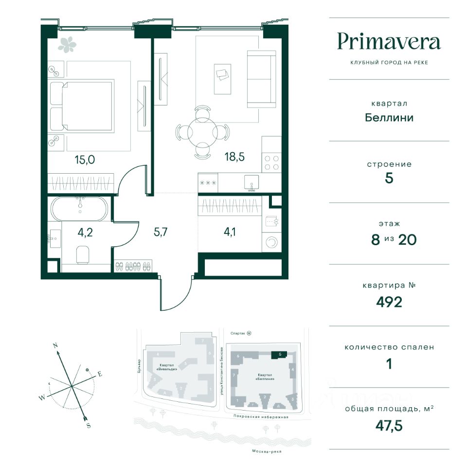 Клубный город на реке Primavera — это респектабельный проект премиум-класса на первой береговой линии Москвы-реки в экологически безупречном районе — Покровское-Стрешнево. Под панорамными окнами квартир расположился собственный экопарк, площадью 12 гектаров с сетью прогулочных дорожек, оборудованный детскими и спортивными площадками, а за ним набережная с собственным пляжем и зонами отдыха. Клубный город на реке Primavera предлагает впечатляющий выбор планировок для любого жизненного сценария: от просторных однокомнатных квартир до пентхаусов и квартир с видовыми террасами или патио. Выбирайте из 120 вариантов эргономичных планировок стандартного и евроформата. В проекте доступны квартиры площадью от 40 до 209 м², в каждой из которых открываются непревзойденные виды на реку, а угол обзора составляет 270 градусов. Из дизайнерских лобби открывается панорамный обзор на зеленый благоустроенный двор. Статусное мебелирование, потолки высотой 6 м и комфортная лаунж-зона отсылают к стилистике высококлассных пятизвездочных отелей. В Primavera есть все, что может предложить мегаполис, здесь все сосредоточено вокруг вас и настроено на ваши желания: - Всестороннее детское развитие в паре шагов от дома: 4 школы, 8 детских садов, развивающие центры с кружками и секциями. - Комфорт мегаполиса на расстоянии приятной прогулки: супермаркеты, кафе, рестораны с верандами на крыше, салоны красоты, аптеки, компании сферы услуг, многофункциональный центр для шоппинга и развлечений. - Умный дом: автоматизированное бесконтактное управление основными системами доступа, инфраструктуры и безопасности через мобильное приложение и специальные метки. Клубный город на реке Primavera выгодно отличается близостью к природе, совмещенной с насыщенной инфраструктурой.