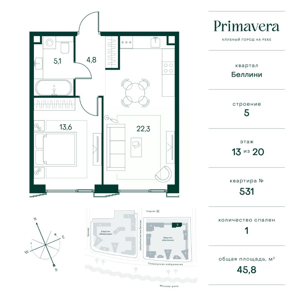 Клубный город на реке Primavera — это респектабельный проект премиум-класса на первой береговой линии Москвы-реки в экологически безупречном районе — Покровское-Стрешнево. Под панорамными окнами квартир расположился собственный экопарк, площадью 12 гектаров с сетью прогулочных дорожек, оборудованный детскими и спортивными площадками, а за ним набережная с собственным пляжем и зонами отдыха. Клубный город на реке Primavera предлагает впечатляющий выбор планировок для любого жизненного сценария: от просторных однокомнатных квартир до пентхаусов и квартир с видовыми террасами или патио. Выбирайте из 120 вариантов эргономичных планировок стандартного и евроформата. В проекте доступны квартиры площадью от 40 до 209 м², в каждой из которых открываются непревзойденные виды на реку, а угол обзора составляет 270 градусов. Из дизайнерских лобби открывается панорамный обзор на зеленый благоустроенный двор. Статусное мебелирование, потолки высотой 6 м и комфортная лаунж-зона отсылают к стилистике высококлассных пятизвездочных отелей. В Primavera есть все, что может предложить мегаполис, здесь все сосредоточено вокруг вас и настроено на ваши желания: - Всестороннее детское развитие в паре шагов от дома: 4 школы, 8 детских садов, развивающие центры с кружками и секциями. - Комфорт мегаполиса на расстоянии приятной прогулки: супермаркеты, кафе, рестораны с верандами на крыше, салоны красоты, аптеки, компании сферы услуг, многофункциональный центр для шоппинга и развлечений. - Умный дом: автоматизированное бесконтактное управление основными системами доступа, инфраструктуры и безопасности через мобильное приложение и специальные метки. Клубный город на реке Primavera выгодно отличается близостью к природе, совмещенной с насыщенной инфраструктурой.