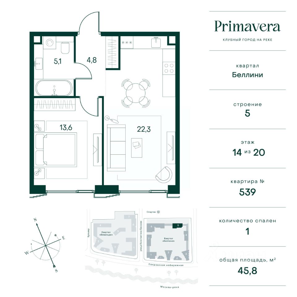 Клубный город на реке Primavera — это современный жилой комплекс премиум-класса, расположенный на первой береговой линии Москвы-реки в экологически чистом районе Покровское-Стрешнево. Под панорамными окнами квартир находится собственный экопарк с продуманной сетью прогулочных дорожек и современными детскими и спортивными площадками. За парком расположена набережная с собственным пляжем и зонами для отдыха. Клубный город на реке Primavera предлагает широкий выбор планировок для различных жизненных сценариев: от просторных однокомнатных квартир до пентхаусов и жилых помещений с террасами и патио. Выберите из 120 вариантов эргономичных планировок стандартного и евроформата. Из каждой квартиры открываются красивые виды на реку с углом обзора в 270 градусов. Дизайнерские лобби предлагают панорамный обзор на благоустроенный двор. Высокие потолки в 6 метров и качественная отделка создают атмосферу, схожую с пятизвездочными отелями. В Primavera есть всё необходимое для комфортной жизни в мегаполисе: • Образование для детей в шаговой доступности: 4 школы, 8 детских садов и развивающие центры с кружками и секциями. • Удобства на расстоянии приятной прогулки: супермаркеты, кафе, рестораны с верандами, салоны красоты, аптеки и многофункциональный центр для шоппинга и развлечений. • Умный дом: автоматизированное бесконтактное управление основными системами доступа и безопасности через мобильное приложение. Клубный город на реке Primavera выгодно сочетает комфорт городской жизни с близостью к природе. Живите в месте, где все создано для вашего удобства!