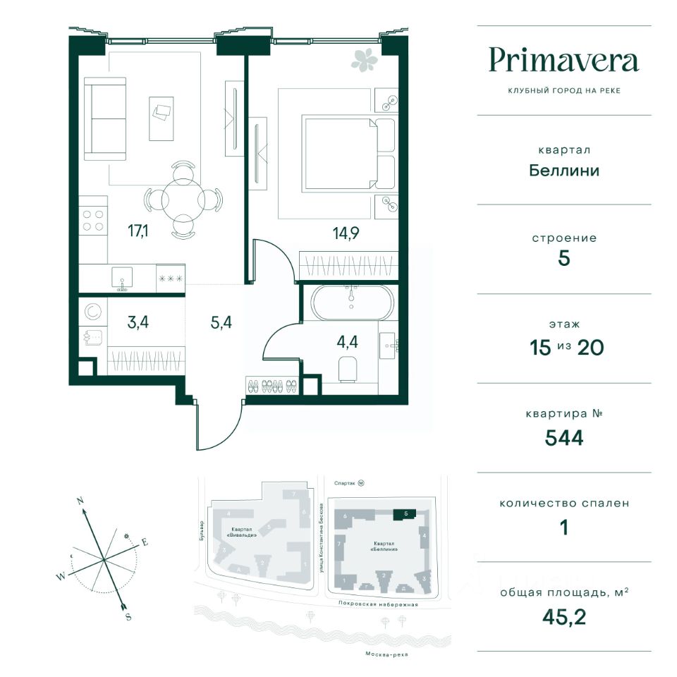 Клубный город на реке Primavera — это современный жилой комплекс премиум-класса, расположенный на первой береговой линии Москвы-реки в экологически чистом районе Покровское-Стрешнево. Под панорамными окнами квартир находится собственный экопарк с продуманной сетью прогулочных дорожек и современными детскими и спортивными площадками. За парком расположена набережная с собственным пляжем и зонами для отдыха. Клубный город на реке Primavera предлагает широкий выбор планировок для различных жизненных сценариев: от просторных однокомнатных квартир до пентхаусов и жилых помещений с террасами и патио. Выберите из 120 вариантов эргономичных планировок стандартного и евроформата. Из каждой квартиры открываются красивые виды на реку с углом обзора в 270 градусов. Дизайнерские лобби предлагают панорамный обзор на благоустроенный двор. Высокие потолки в 6 метров и качественная отделка создают атмосферу, схожую с пятизвездочными отелями. В Primavera есть всё необходимое для комфортной жизни в мегаполисе: • Образование для детей в шаговой доступности: 4 школы, 8 детских садов и развивающие центры с кружками и секциями. • Удобства на расстоянии приятной прогулки: супермаркеты, кафе, рестораны с верандами, салоны красоты, аптеки и многофункциональный центр для шоппинга и развлечений. • Умный дом: автоматизированное бесконтактное управление основными системами доступа и безопасности через мобильное приложение. Клубный город на реке Primavera выгодно сочетает комфорт городской жизни с близостью к природе. Живите в месте, где все создано для вашего удобства!