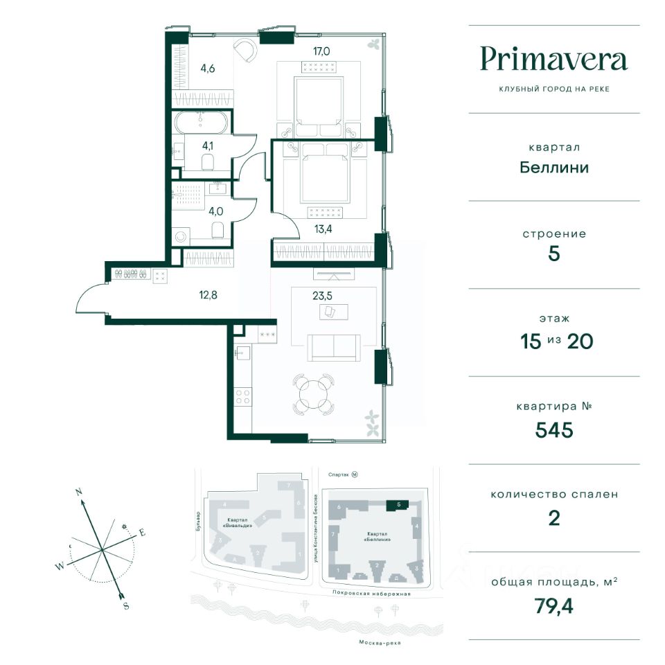 Клубный город на реке Primavera — это респектабельный проект премиум-класса на первой береговой линии Москвы-реки в экологически безупречном районе — Покровское-Стрешнево. Под панорамными окнами квартир расположился собственный экопарк, площадью 12 гектаров с сетью прогулочных дорожек, оборудованный детскими и спортивными площадками, а за ним набережная с собственным пляжем и зонами отдыха. Клубный город на реке Primavera предлагает впечатляющий выбор планировок для любого жизненного сценария: от просторных однокомнатных квартир до пентхаусов и квартир с видовыми террасами или патио. Выбирайте из 120 вариантов эргономичных планировок стандартного и евроформата. В проекте доступны квартиры площадью от 40 до 209 м², в каждой из которых открываются непревзойденные виды на реку, а угол обзора составляет 270 градусов. Из дизайнерских лобби открывается панорамный обзор на зеленый благоустроенный двор. Статусное мебелирование, потолки высотой 6 м и комфортная лаунж-зона отсылают к стилистике высококлассных пятизвездочных отелей. В Primavera есть все, что может предложить мегаполис, здесь все сосредоточено вокруг вас и настроено на ваши желания: - Всестороннее детское развитие в паре шагов от дома: 4 школы, 8 детских садов, развивающие центры с кружками и секциями. - Комфорт мегаполиса на расстоянии приятной прогулки: супермаркеты, кафе, рестораны с верандами на крыше, салоны красоты, аптеки, компании сферы услуг, многофункциональный центр для шоппинга и развлечений. - Умный дом: автоматизированное бесконтактное управление основными системами доступа, инфраструктуры и безопасности через мобильное приложение и специальные метки. Клубный город на реке Primavera выгодно отличается близостью к природе, совмещенной с насыщенной инфраструктурой.