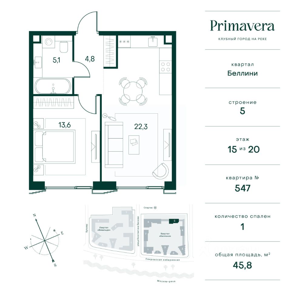 Клубный город на реке Primavera — это респектабельный проект премиум-класса на первой береговой линии Москвы-реки в экологически безупречном районе — Покровское-Стрешнево. Под панорамными окнами квартир расположился собственный экопарк, площадью 12 гектаров с сетью прогулочных дорожек, оборудованный детскими и спортивными площадками, а за ним набережная с собственным пляжем и зонами отдыха. Клубный город на реке Primavera предлагает впечатляющий выбор планировок для любого жизненного сценария: от просторных однокомнатных квартир до пентхаусов и квартир с видовыми террасами или патио. Выбирайте из 120 вариантов эргономичных планировок стандартного и евроформата. В проекте доступны квартиры площадью от 40 до 209 м², в каждой из которых открываются непревзойденные виды на реку, а угол обзора составляет 270 градусов. Из дизайнерских лобби открывается панорамный обзор на зеленый благоустроенный двор. Статусное мебелирование, потолки высотой 6 м и комфортная лаунж-зона отсылают к стилистике высококлассных пятизвездочных отелей. В Primavera есть все, что может предложить мегаполис, здесь все сосредоточено вокруг вас и настроено на ваши желания: - Всестороннее детское развитие в паре шагов от дома: 4 школы, 8 детских садов, развивающие центры с кружками и секциями. - Комфорт мегаполиса на расстоянии приятной прогулки: супермаркеты, кафе, рестораны с верандами на крыше, салоны красоты, аптеки, компании сферы услуг, многофункциональный центр для шоппинга и развлечений. - Умный дом: автоматизированное бесконтактное управление основными системами доступа, инфраструктуры и безопасности через мобильное приложение и специальные метки. Клубный город на реке Primavera выгодно отличается близостью к природе, совмещенной с насыщенной инфраструктурой.