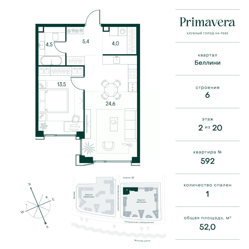 Клубный город на реке "Примавера" — это современный жилой комплекс премиум-класса, расположенный на первой береговой линии Москвы-реки в экологически чистом районе Покровское-Стрешнево. Под панорамными окнами квартир находится собственный экопарк с продуманной сетью прогулочных дорожек и современными детскими и спортивными площадками. За парком расположена набережная с собственным пляжем и зонами для отдыха. Клубный город на реке "Примавера" предлагает широкий выбор планировок для различных жизненных сценариев: от просторных однокомнатных квартир до пентхаусов и жилых помещений с террасами и патио. Выберите из 120 вариантов эргономичных планировок стандартного и евроформата. Из каждой квартиры открываются красивые виды на реку с углом обзора в 270 градусов. Дизайнерские лобби предлагают панорамный обзор на благоустроенный двор. Высокие потолки в 6 метров и качественная отделка создают атмосферу, схожую с пятизвездочными отелями. В "Примавера" есть всё необходимое для комфортной жизни в мегаполисе: • Образование для детей в шаговой доступности: 4 школы, 8 детских садов и развивающие центры с кружками и секциями. • Удобства на расстоянии приятной прогулки: супермаркеты, кафе, рестораны с верандами, салоны красоты, аптеки и многофункциональный центр для шоппинга и развлечений. • Умный дом: автоматизированное бесконтактное управление основными системами доступа и безопасности через мобильное приложение. Клубный город на реке "Примавера" выгодно сочетает комфорт городской жизни с близостью к природе. Живите в месте, где все создано для вашего удобства!