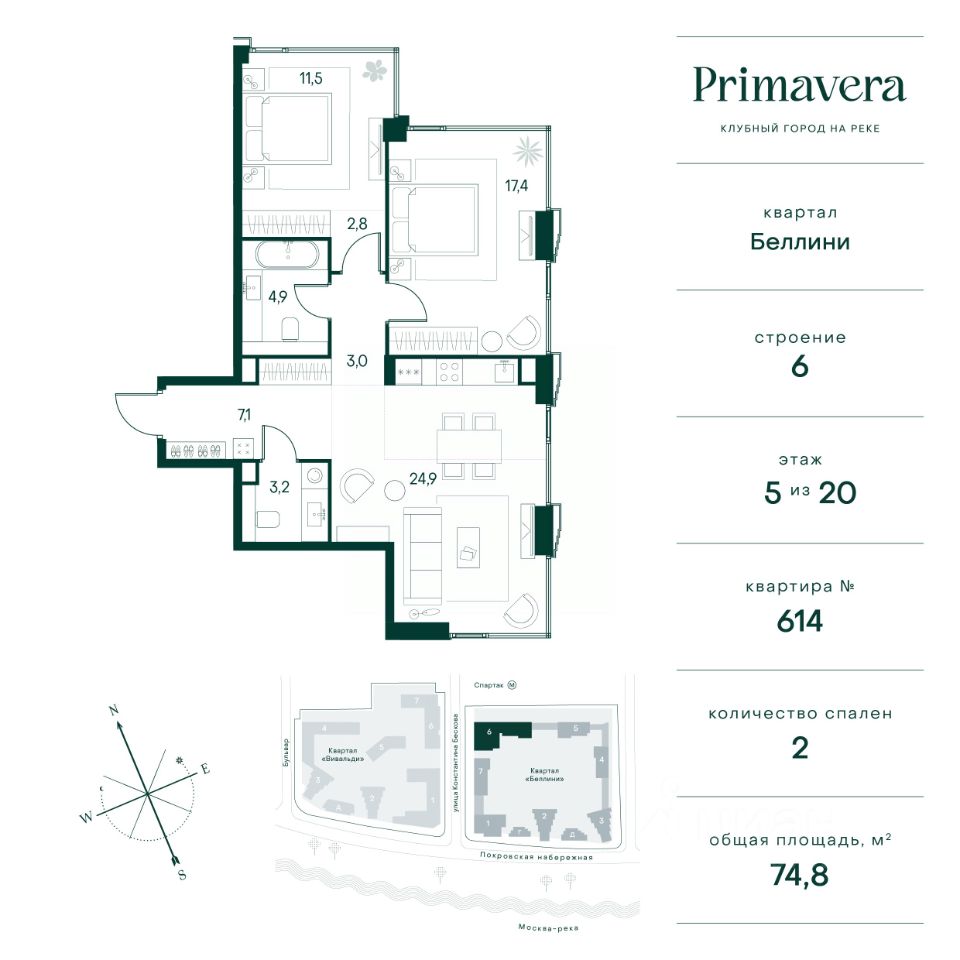 Клубный город на реке Primavera — это респектабельный проект премиум-класса на первой береговой линии Москвы-реки в экологически безупречном районе — Покровское-Стрешнево. Под панорамными окнами квартир расположился собственный экопарк, площадью 12 гектаров с сетью прогулочных дорожек, оборудованный детскими и спортивными площадками, а за ним набережная с собственным пляжем и зонами отдыха. Клубный город на реке Primavera предлагает впечатляющий выбор планировок для любого жизненного сценария: от просторных однокомнатных квартир до пентхаусов и квартир с видовыми террасами или патио. Выбирайте из 120 вариантов эргономичных планировок стандартного и евроформата. В проекте доступны квартиры площадью от 40 до 209 м², в каждой из которых открываются непревзойденные виды на реку, а угол обзора составляет 270 градусов. Из дизайнерских лобби открывается панорамный обзор на зеленый благоустроенный двор. Статусное мебелирование, потолки высотой 6 м и комфортная лаунж-зона отсылают к стилистике высококлассных пятизвездочных отелей. В Primavera есть все, что может предложить мегаполис, здесь все сосредоточено вокруг вас и настроено на ваши желания: - Всестороннее детское развитие в паре шагов от дома: 4 школы, 8 детских садов, развивающие центры с кружками и секциями. - Комфорт мегаполиса на расстоянии приятной прогулки: супермаркеты, кафе, рестораны с верандами на крыше, салоны красоты, аптеки, компании сферы услуг, многофункциональный центр для шоппинга и развлечений. - Умный дом: автоматизированное бесконтактное управление основными системами доступа, инфраструктуры и безопасности через мобильное приложение и специальные метки. Клубный город на реке Primavera выгодно отличается близостью к природе, совмещенной с насыщенной инфраструктурой.