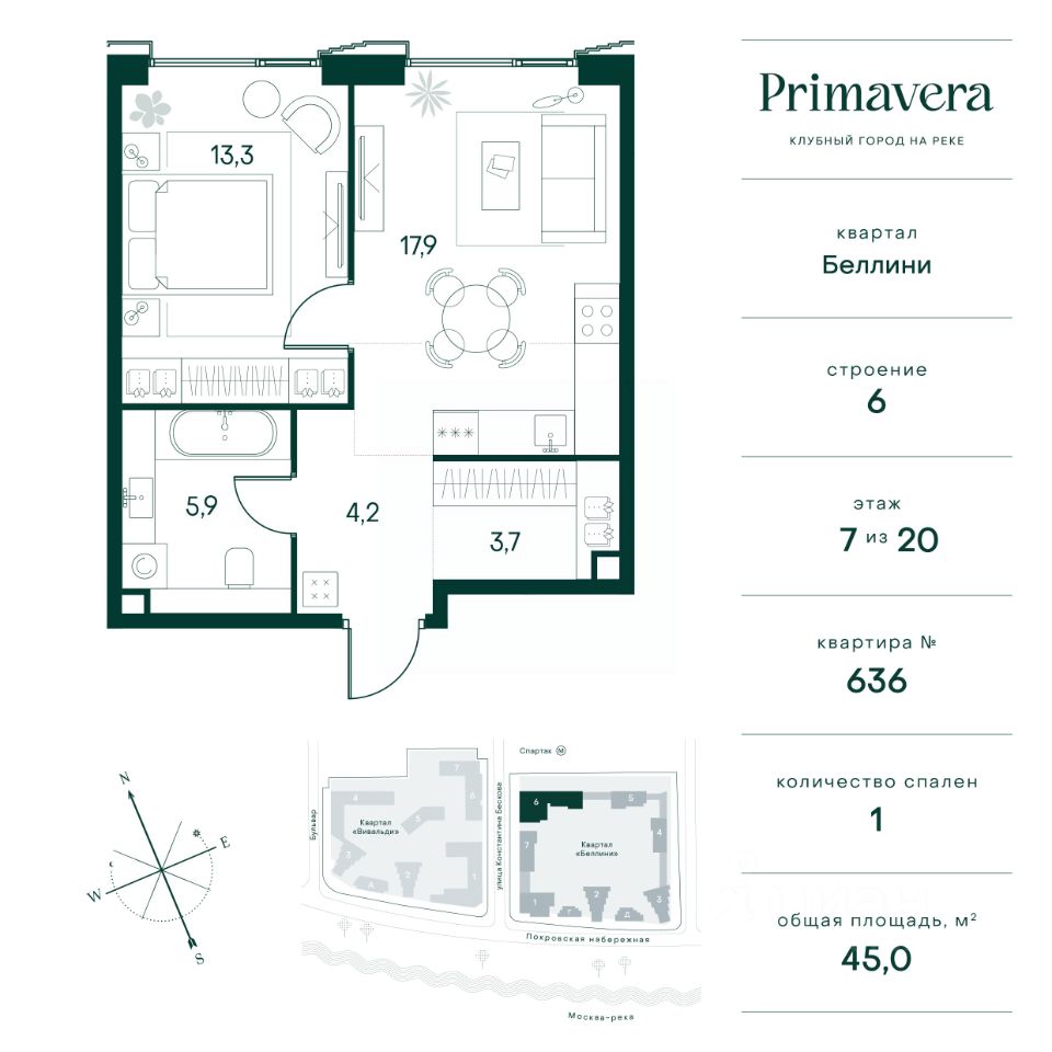 Клубный город на реке Primavera — это современный жилой комплекс премиум-класса, расположенный на первой береговой линии Москвы-реки в экологически чистом районе Покровское-Стрешнево. Под панорамными окнами квартир находится собственный экопарк с продуманной сетью прогулочных дорожек и современными детскими и спортивными площадками. За парком расположена набережная с собственным пляжем и зонами для отдыха. Клубный город на реке Primavera предлагает широкий выбор планировок для различных жизненных сценариев: от просторных однокомнатных квартир до пентхаусов и жилых помещений с террасами и патио. Выберите из 120 вариантов эргономичных планировок стандартного и евроформата. Из каждой квартиры открываются красивые виды на реку с углом обзора в 270 градусов. Дизайнерские лобби предлагают панорамный обзор на благоустроенный двор. Высокие потолки в 6 метров и качественная отделка создают атмосферу, схожую с пятизвездочными отелями. В Primavera есть всё необходимое для комфортной жизни в мегаполисе: • Образование для детей в шаговой доступности: 4 школы, 8 детских садов и развивающие центры с кружками и секциями. • Удобства на расстоянии приятной прогулки: супермаркеты, кафе, рестораны с верандами, салоны красоты, аптеки и многофункциональный центр для шоппинга и развлечений. • Умный дом: автоматизированное бесконтактное управление основными системами доступа и безопасности через мобильное приложение. Клубный город на реке Primavera выгодно сочетает комфорт городской жизни с близостью к природе. Живите в месте, где все создано для вашего удобства!