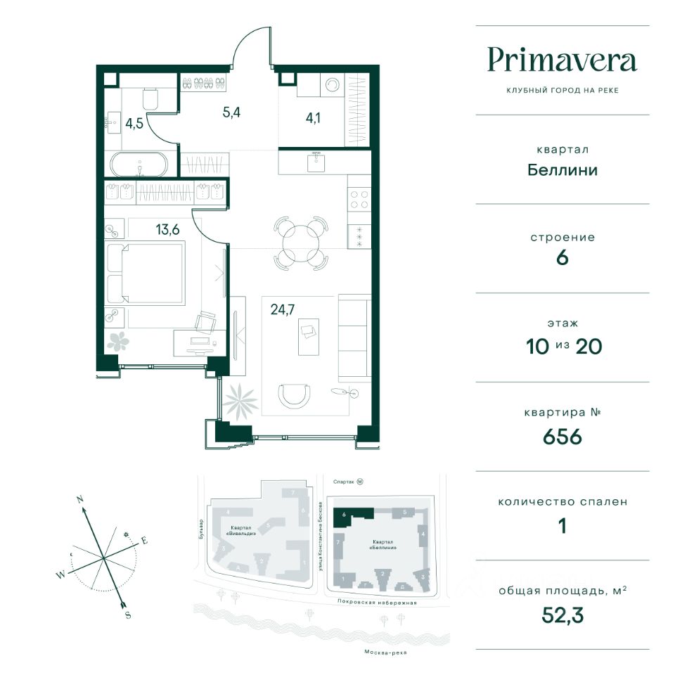 Клубный город на реке Primavera — это современный жилой комплекс премиум-класса, расположенный на первой береговой линии Москвы-реки в экологически чистом районе Покровское-Стрешнево. Под панорамными окнами квартир находится собственный экопарк с продуманной сетью прогулочных дорожек и современными детскими и спортивными площадками. За парком расположена набережная с собственным пляжем и зонами для отдыха. Клубный город на реке Primavera предлагает широкий выбор планировок для различных жизненных сценариев: от просторных однокомнатных квартир до пентхаусов и жилых помещений с террасами и патио. Выберите из 120 вариантов эргономичных планировок стандартного и евроформата. Из каждой квартиры открываются красивые виды на реку с углом обзора в 270 градусов. Дизайнерские лобби предлагают панорамный обзор на благоустроенный двор. Высокие потолки в 6 метров и качественная отделка создают атмосферу, схожую с пятизвездочными отелями. В Primavera есть всё необходимое для комфортной жизни в мегаполисе: • Образование для детей в шаговой доступности: 4 школы, 8 детских садов и развивающие центры с кружками и секциями. • Удобства на расстоянии приятной прогулки: супермаркеты, кафе, рестораны с верандами, салоны красоты, аптеки и многофункциональный центр для шоппинга и развлечений. • Умный дом: автоматизированное бесконтактное управление основными системами доступа и безопасности через мобильное приложение. Клубный город на реке Primavera выгодно сочетает комфорт городской жизни с близостью к природе. Живите в месте, где все создано для вашего удобства!