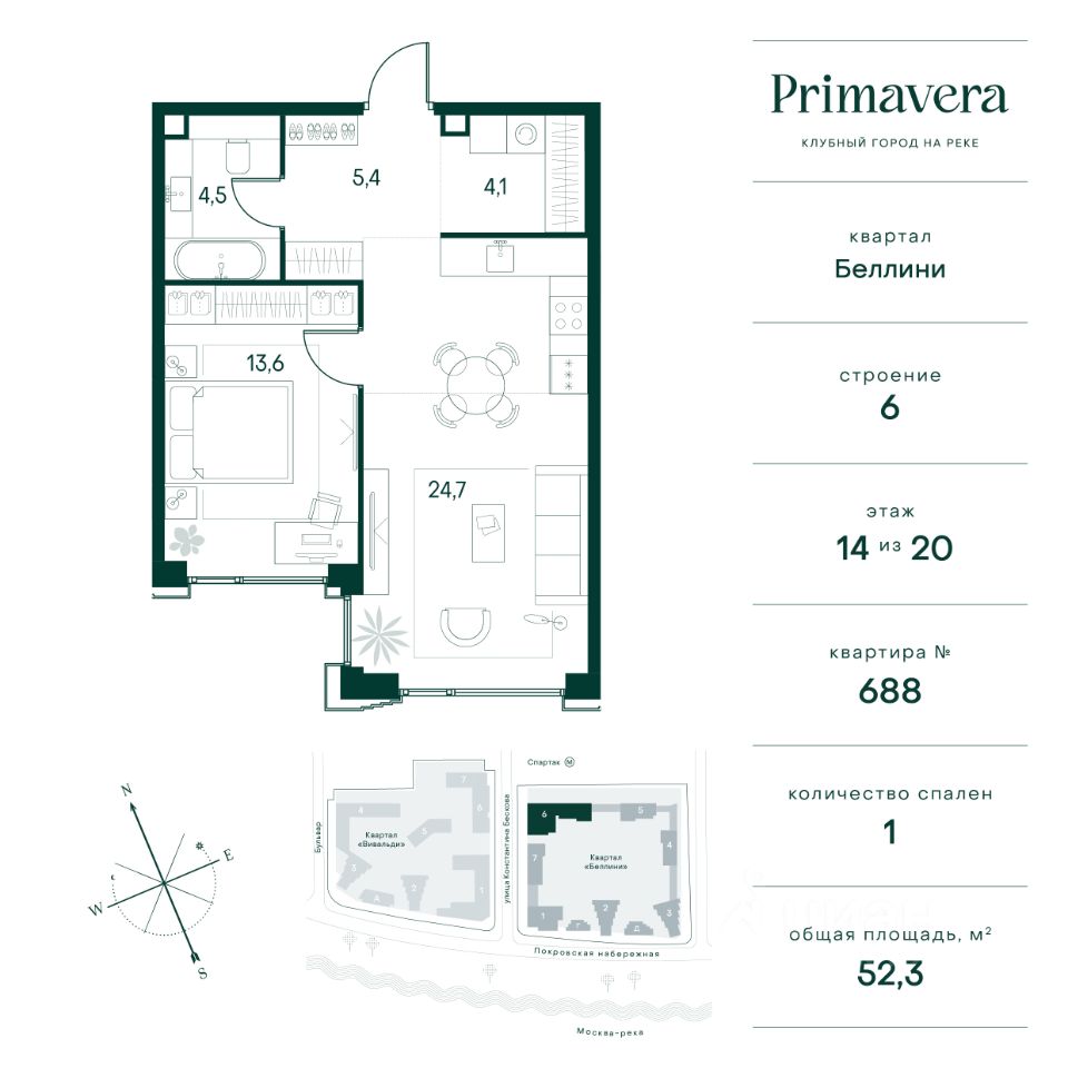 Клубный город на реке Primavera — это респектабельный проект премиум-класса на первой береговой линии Москвы-реки в экологически безупречном районе — Покровское-Стрешнево. Под панорамными окнами квартир расположился собственный экопарк, площадью 12 гектаров с сетью прогулочных дорожек, оборудованный детскими и спортивными площадками, а за ним набережная с собственным пляжем и зонами отдыха. Клубный город на реке Primavera предлагает впечатляющий выбор планировок для любого жизненного сценария: от просторных однокомнатных квартир до пентхаусов и квартир с видовыми террасами или патио. Выбирайте из 120 вариантов эргономичных планировок стандартного и евроформата. В проекте доступны квартиры площадью от 40 до 209 м², в каждой из которых открываются непревзойденные виды на реку, а угол обзора составляет 270 градусов. Из дизайнерских лобби открывается панорамный обзор на зеленый благоустроенный двор. Статусное мебелирование, потолки высотой 6 м и комфортная лаунж-зона отсылают к стилистике высококлассных пятизвездочных отелей. В Primavera есть все, что может предложить мегаполис, здесь все сосредоточено вокруг вас и настроено на ваши желания: - Всестороннее детское развитие в паре шагов от дома: 4 школы, 8 детских садов, развивающие центры с кружками и секциями. - Комфорт мегаполиса на расстоянии приятной прогулки: супермаркеты, кафе, рестораны с верандами на крыше, салоны красоты, аптеки, компании сферы услуг, многофункциональный центр для шоппинга и развлечений. - Умный дом: автоматизированное бесконтактное управление основными системами доступа, инфраструктуры и безопасности через мобильное приложение и специальные метки. Клубный город на реке Primavera выгодно отличается близостью к природе, совмещенной с насыщенной инфраструктурой.