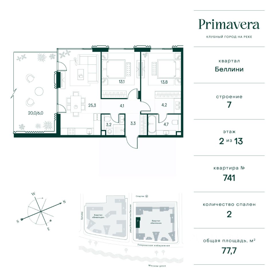 Клубный город на реке Primavera — это респектабельный проект премиум-класса на первой береговой линии Москвы-реки в экологически безупречном районе — Покровское-Стрешнево. Под панорамными окнами квартир расположился собственный экопарк, площадью 12 гектаров с сетью прогулочных дорожек, оборудованный детскими и спортивными площадками, а за ним набережная с собственным пляжем и зонами отдыха. Клубный город на реке Primavera предлагает впечатляющий выбор планировок для любого жизненного сценария: от просторных однокомнатных квартир до пентхаусов и квартир с видовыми террасами или патио. Выбирайте из 120 вариантов эргономичных планировок стандартного и евроформата. В проекте доступны квартиры площадью от 40 до 209 м², в каждой из которых открываются непревзойденные виды на реку, а угол обзора составляет 270 градусов. Из дизайнерских лобби открывается панорамный обзор на зеленый благоустроенный двор. Статусное мебелирование, потолки высотой 6 м и комфортная лаунж-зона отсылают к стилистике высококлассных пятизвездочных отелей. В Primavera есть все, что может предложить мегаполис, здесь все сосредоточено вокруг вас и настроено на ваши желания: - Всестороннее детское развитие в паре шагов от дома: 4 школы, 8 детских садов, развивающие центры с кружками и секциями. - Комфорт мегаполиса на расстоянии приятной прогулки: супермаркеты, кафе, рестораны с верандами на крыше, салоны красоты, аптеки, компании сферы услуг, многофункциональный центр для шоппинга и развлечений. - Умный дом: автоматизированное бесконтактное управление основными системами доступа, инфраструктуры и безопасности через мобильное приложение и специальные метки. Клубный город на реке Primavera выгодно отличается близостью к природе, совмещенной с насыщенной инфраструктурой.